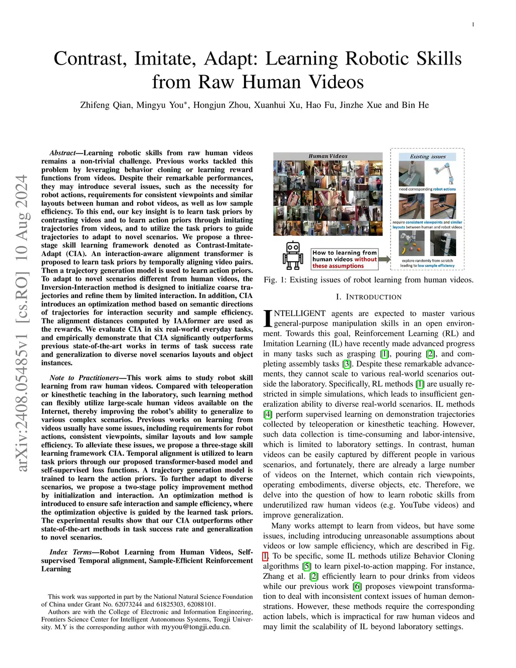 Learning robotic skills from raw human videos remains a non-trivial challenge. Previous works tackled this problem by leveraging behavior cloning or learning reward functions from videos. Despite their remarkable performances, they may introduce several issues, such as the necessity for robot actions, requirements for consistent viewpoints and similar layouts between human and robot videos, as well as low sample efficiency. To this end, our key insight is to learn task priors by contrasting videos and to learn action priors through imitating trajectories from videos, and to utilize the task priors to guide trajectories to adapt to novel scenarios. We propose a three-stage skill learning framework denoted as Contrast-Imitate-Adapt (CIA). An interaction-aware alignment transformer is proposed to learn task priors by temporally aligning video pairs. Then a trajectory generation model is used to learn action priors. To adapt to novel scenarios different from human videos, the Inversion-Interaction method is designed to initialize coarse trajectories and refine them by limited interaction. In addition, CIA introduces an optimization method based on semantic directions of trajectories for interaction security and sample efficiency. The alignment distances computed by IAAformer are used as the rewards. We evaluate CIA in six real-world everyday tasks, and empirically demonstrate that CIA significantly outperforms previous state-of-the-art works in terms of task success rate and generalization to diverse novel scenarios layouts and object instances.