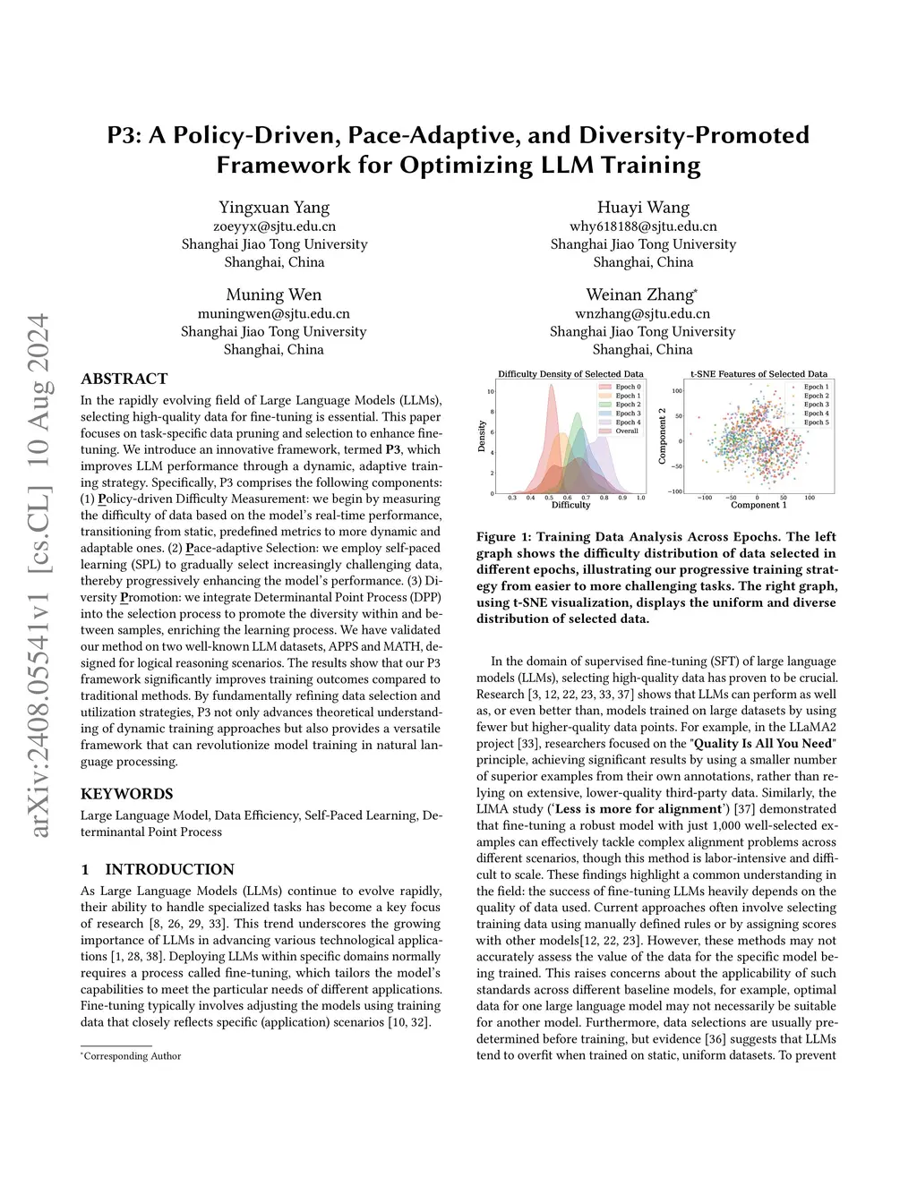 In the rapidly evolving field of Large Language Models (LLMs), selecting high-quality data for fine-tuning is essential. This paper focuses on task-specific data pruning and selection to enhance fine-tuning. We introduce an innovative framework, termed P3, which improves LLM performance through a dynamic, adaptive training strategy. Specifically, P3 comprises the following components: (1) Policy-driven Difficulty Measurement: we begin by measuring the difficulty of data based on the model's real-time performance, transitioning from static, predefined metrics to more dynamic and adaptable ones. (2) Pace-adaptive Selection: we employ self-paced learning (SPL) to gradually select increasingly challenging data, thereby progressively enhancing the model's performance. (3) Diversity Promotion: we integrate Determinantal Point Process (DPP) into the selection process to promote the diversity within and between samples, enriching the learning process. We have validated our method on two well-known LLM datasets, APPS and MATH, designed for logical reasoning scenarios. The results show that our P3 framework significantly improves training outcomes compared to traditional methods. By fundamentally refining data selection and utilization strategies, P3 not only advances theoretical understanding of dynamic training approaches but also provides a versatile framework that can revolutionize model training in natural language processing.