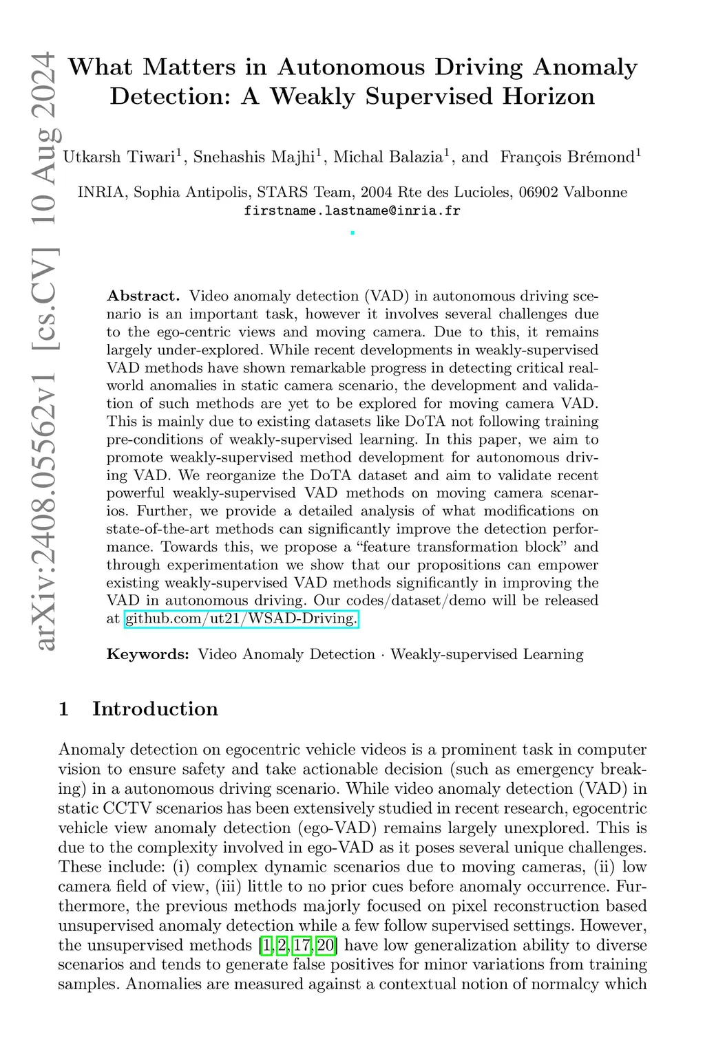 Video anomaly detection (VAD) in autonomous driving scenario is an important task, however it involves several challenges due to the ego-centric views and moving camera. Due to this, it remains largely under-explored. While recent developments in weakly-supervised VAD methods have shown remarkable progress in detecting critical real-world anomalies in static camera scenario, the development and validation of such methods are yet to be explored for moving camera VAD. This is mainly due to existing datasets like DoTA not following training pre-conditions of weakly-supervised learning. In this paper, we aim to promote weakly-supervised method development for autonomous driving VAD. We reorganize the DoTA dataset and aim to validate recent powerful weakly-supervised VAD methods on moving camera scenarios. Further, we provide a detailed analysis of what modifications on state-of-the-art methods can significantly improve the detection performance. Towards this, we propose a "feature transformation block" and through experimentation we show that our propositions can empower existing weakly-supervised VAD methods significantly in improving the VAD in autonomous driving. Our codes/dataset/demo will be released at github.com/ut21/WSAD-Driving