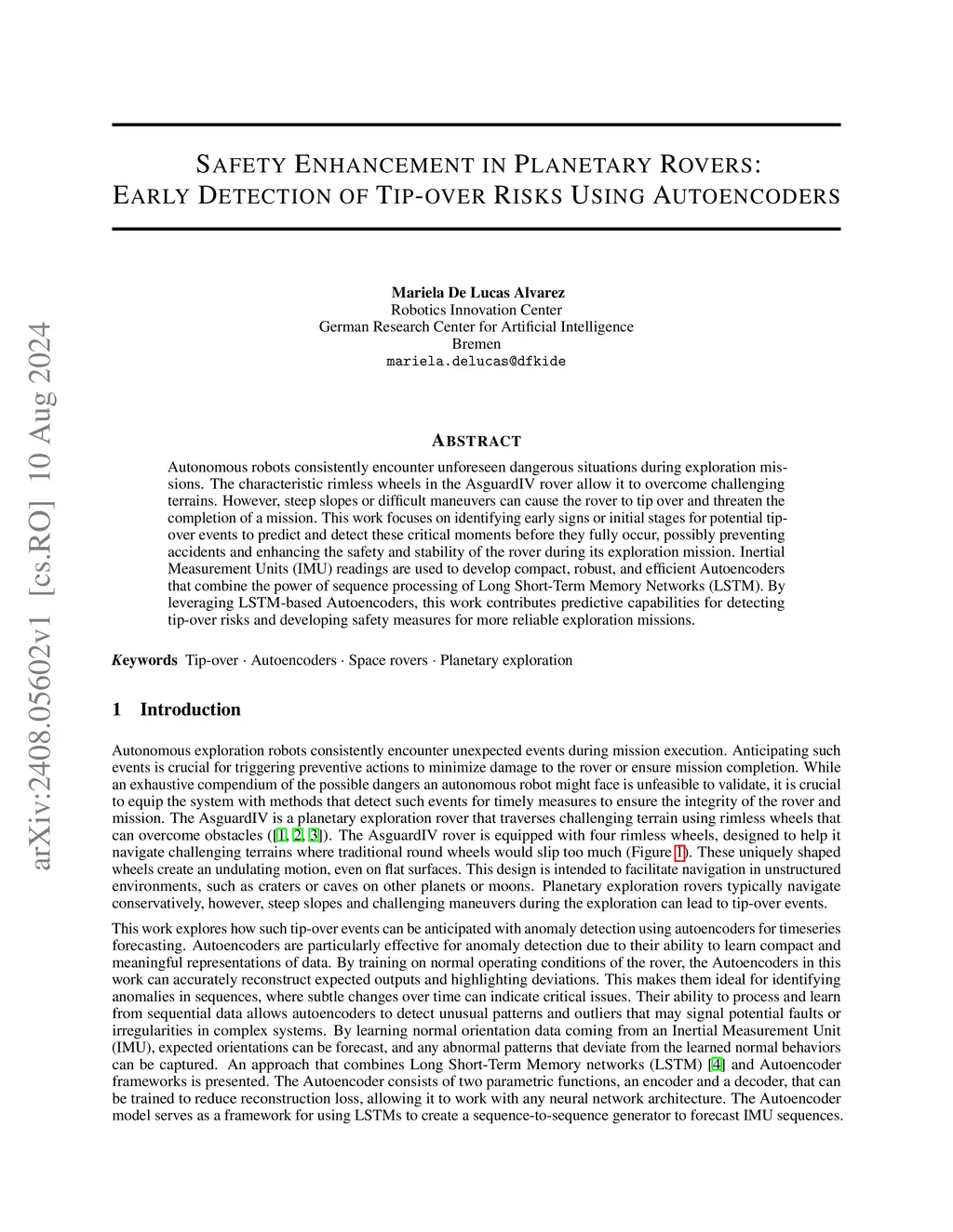 Autonomous robots consistently encounter unforeseen dangerous situations during exploration missions. The characteristic rimless wheels in the AsguardIV rover allow it to overcome challenging terrains. However, steep slopes or difficult maneuvers can cause the rover to tip over and threaten the completion of a mission. This work focuses on identifying early signs or initial stages for potential tip-over events to predict and detect these critical moments before they fully occur, possibly preventing accidents and enhancing the safety and stability of the rover during its exploration mission. Inertial Measurement Units (IMU) readings are used to develop compact, robust, and efficient Autoencoders that combine the power of sequence processing of Long Short-Term Memory Networks (LSTM). By leveraging LSTM-based Autoencoders, this work contributes predictive capabilities for detecting tip-over risks and developing safety measures for more reliable exploration missions.