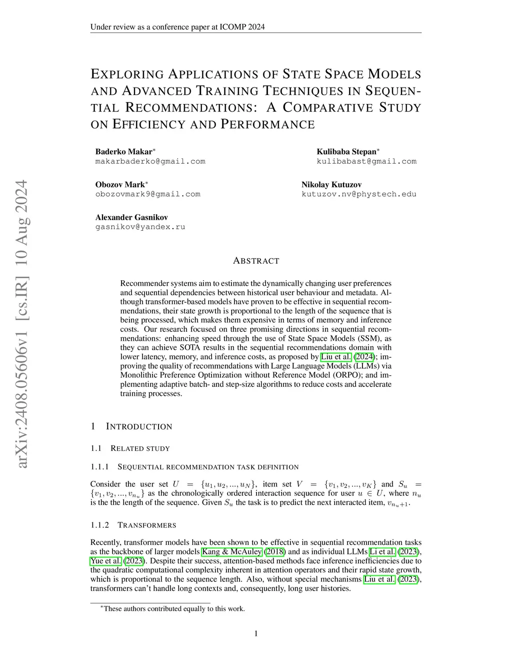 Recommender systems aim to estimate the dynamically changing user preferences and sequential dependencies between historical user behaviour and metadata. Although transformer-based models have proven to be effective in sequential recommendations, their state growth is proportional to the length of the sequence that is being processed, which makes them expensive in terms of memory and inference costs. Our research focused on three promising directions in sequential recommendations: enhancing speed through the use of State Space Models (SSM), as they can achieve SOTA results in the sequential recommendations domain with lower latency, memory, and inference costs, as proposed byarXiv:2403.03900improving the quality of recommendations with Large Language Models (LLMs) via Monolithic Preference Optimization without Reference Model (ORPO); and implementing adaptive batch- and step-size algorithms to reduce costs and accelerate training processes.