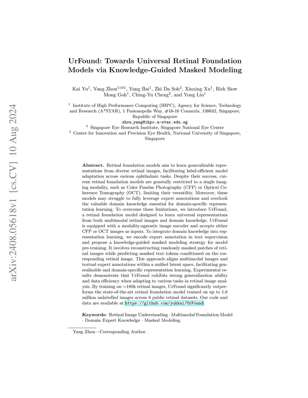Retinal foundation models aim to learn generalizable representations from diverse retinal images, facilitating label-efficient model adaptation across various ophthalmic tasks. Despite their success, current retinal foundation models are generally restricted to a single imaging modality, such as Color Fundus Photography (CFP) or Optical Coherence Tomography (OCT), limiting their versatility. Moreover, these models may struggle to fully leverage expert annotations and overlook the valuable domain knowledge essential for domain-specific representation learning. To overcome these limitations, we introduce UrFound, a retinal foundation model designed to learn universal representations from both multimodal retinal images and domain knowledge. UrFound is equipped with a modality-agnostic image encoder and accepts either CFP or OCT images as inputs. To integrate domain knowledge into representation learning, we encode expert annotation in text supervision and propose a knowledge-guided masked modeling strategy for model pre-training. It involves reconstructing randomly masked patches of retinal images while predicting masked text tokens conditioned on the corresponding retinal image. This approach aligns multimodal images and textual expert annotations within a unified latent space, facilitating generalizable and domain-specific representation learning. Experimental results demonstrate that UrFound exhibits strong generalization ability and data efficiency when adapting to various tasks in retinal image analysis. By training on ~180k retinal images, UrFound significantly outperforms the state-of-the-art retinal foundation model trained on up to 1.6 million unlabelled images across 8 public retinal datasets. Our code and data are available at https://github.com/yukkai/UrFound.