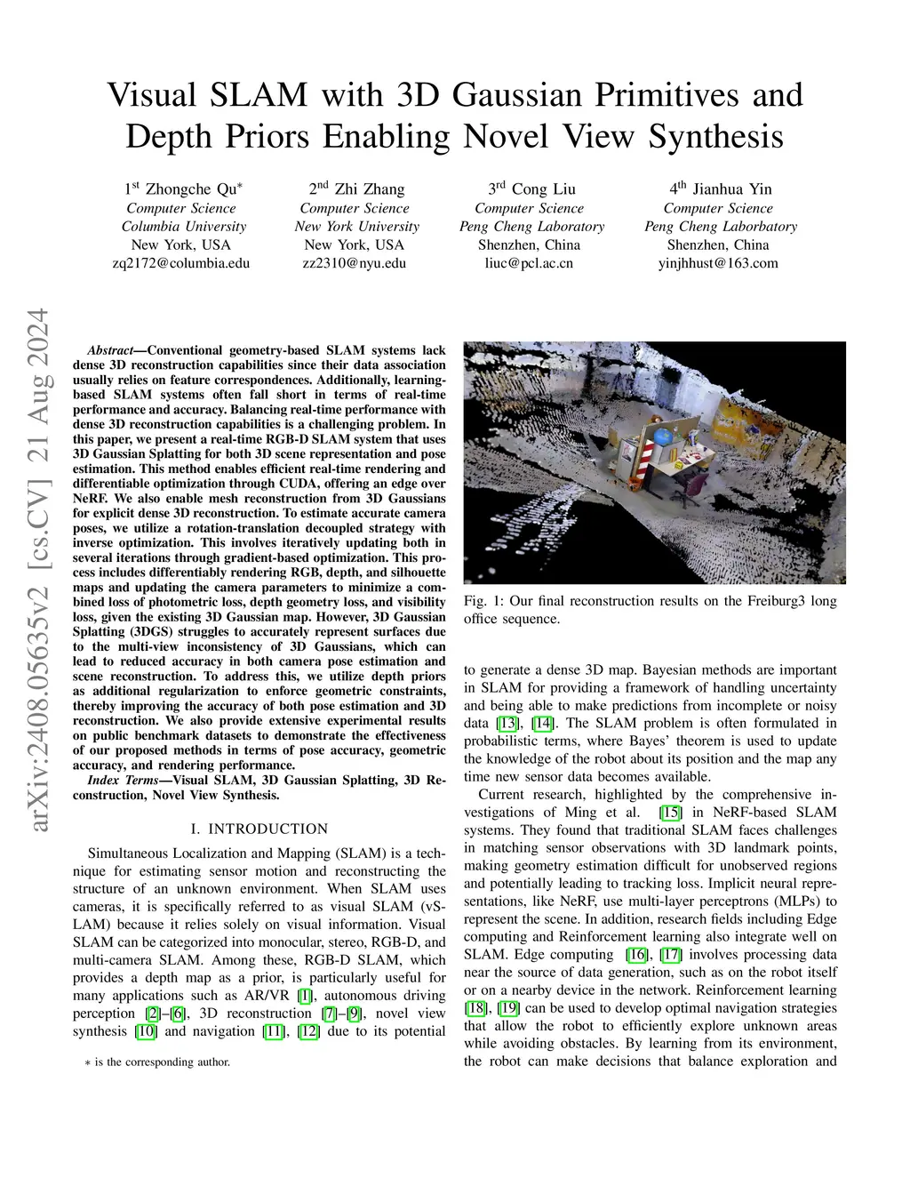 Visual SLAM with 3D Gaussian Primitives and Depth Priors Enabling Novel