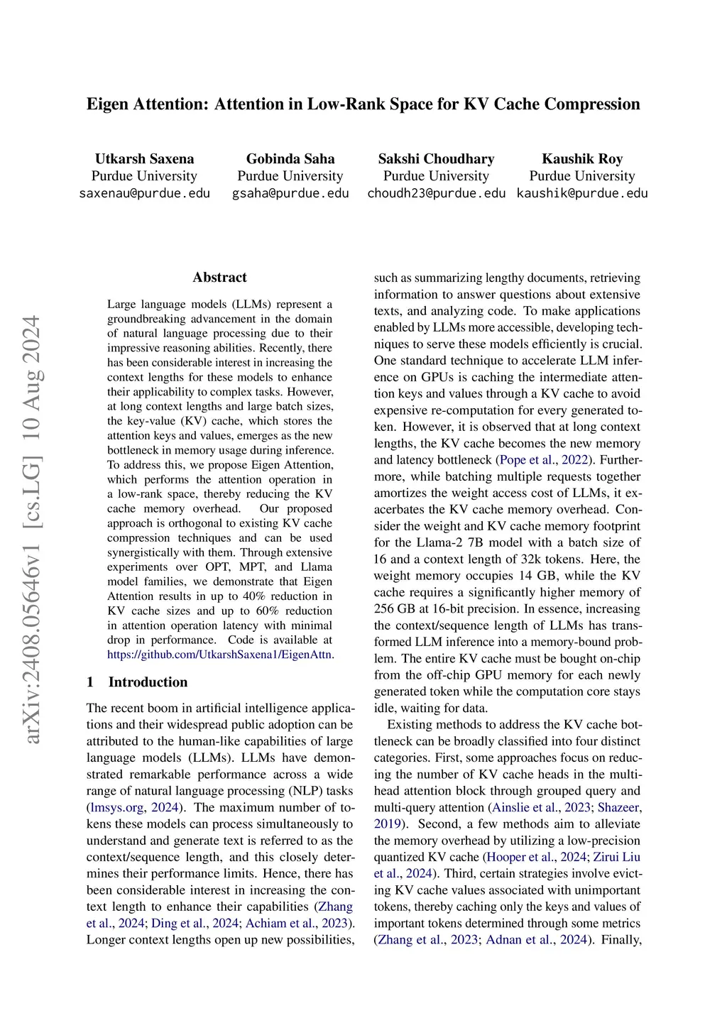 Large language models (LLMs) represent a groundbreaking advancement in the domain of natural language processing due to their impressive reasoning abilities. Recently, there has been considerable interest in increasing the context lengths for these models to enhance their applicability to complex tasks. However, at long context lengths and large batch sizes, the key-value (KV) cache, which stores the attention keys and values, emerges as the new bottleneck in memory usage during inference. To address this, we propose Eigen Attention, which performs the attention operation in a low-rank space, thereby reducing the KV cache memory overhead. Our proposed approach is orthogonal to existing KV cache compression techniques and can be used synergistically with them. Through extensive experiments over OPT, MPT, and Llama model families, we demonstrate that Eigen Attention results in up to 40% reduction in KV cache sizes and up to 60% reduction in attention operation latency with minimal drop in performance.