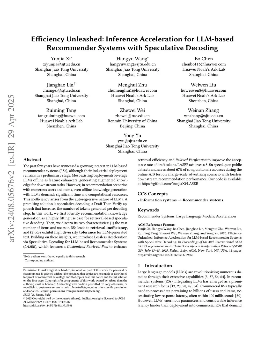 The past few years have witnessed a growing interest in LLM-based recommender systems (RSs), although their industrial deployment remains in a preliminary stage. Most existing deployments leverage LLMs offline as feature enhancers, generating augmented knowledge for downstream tasks. However, in recommendation scenarios with numerous users and items, even offline knowledge generation with LLMs demands significant time and computational resources. This inefficiency arises from the autoregressive nature of LLMs. A promising solution is speculative decoding, a Draft-Then-Verify approach that increases the number of tokens generated per decoding step. In this work, we first identify recommendation knowledge generation as a highly fitting use case for retrieval-based speculative decoding. Then, we discern its two characteristics: (1) the vast number of items and users in RSs leads to retrieval inefficiency, and (2) RSs exhibit high diversity tolerance for LLM-generated text. Building on these insights, we introduce Lossless Acceleration via Speculative Decoding for LLM-based Recommender Systems (LASER), which features a Customized Retrieval Pool to enhance retrieval efficiency and Relaxed Verification to improve the acceptance rate of draft tokens. LASER achieves a 3-5x speedup on public datasets and saves about 67\% of computational resources during the online A/B test on a large-scale advertising scenario with lossless downstream recommendation performance. Our code is available atthis https URL