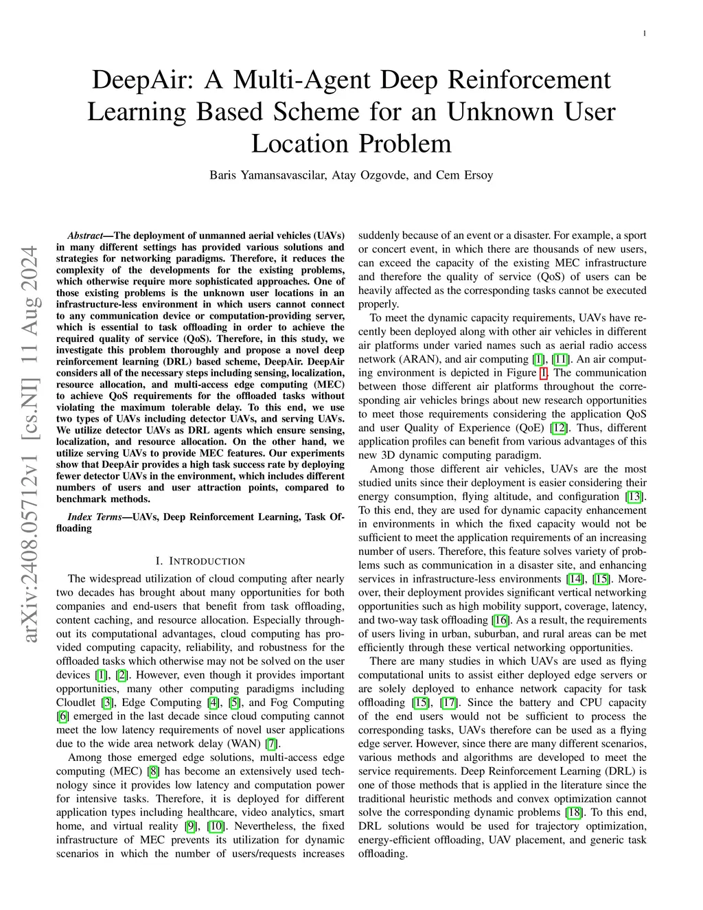 The deployment of unmanned aerial vehicles (UAVs) in many different settings has provided various solutions and strategies for networking paradigms. Therefore, it reduces the complexity of the developments for the existing problems, which otherwise require more sophisticated approaches. One of those existing problems is the unknown user locations in an infrastructure-less environment in which users cannot connect to any communication device or computation-providing server, which is essential to task offloading in order to achieve the required quality of service (QoS). Therefore, in this study, we investigate this problem thoroughly and propose a novel deep reinforcement learning (DRL) based scheme, DeepAir. DeepAir considers all of the necessary steps including sensing, localization, resource allocation, and multi-access edge computing (MEC) to achieve QoS requirements for the offloaded tasks without violating the maximum tolerable delay. To this end, we use two types of UAVs including detector UAVs, and serving UAVs. We utilize detector UAVs as DRL agents which ensure sensing, localization, and resource allocation. On the other hand, we utilize serving UAVs to provide MEC features. Our experiments show that DeepAir provides a high task success rate by deploying fewer detector UAVs in the environment, which includes different numbers of users and user attraction points, compared to benchmark methods.