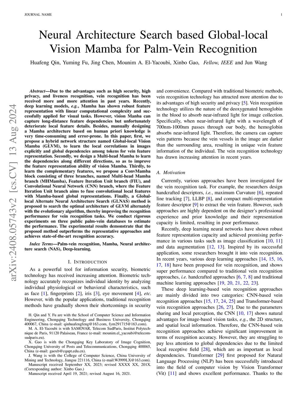 Due to the advantages such as high security, high privacy, and liveness recognition, vein recognition has been received more and more attention in past years. Recently, deep learning models, e.g., Mamba has shown robust feature representation with linear computational complexity and successfully applied for visual tasks. However, vision Manba can capture long-distance feature dependencies but unfortunately deteriorate local feature details. Besides, manually designing a Mamba architecture based on human priori knowledge is very time-consuming and error-prone. In this paper, first, we propose a hybrid network structure named Global-local Vision Mamba (GLVM), to learn the local correlations in images explicitly and global dependencies among tokens for vein feature representation. Secondly, we design a Multi-head Mamba to learn the dependencies along different directions, so as to improve the feature representation ability of vision Mamba. Thirdly, to learn the complementary features, we propose a ConvMamba block consisting of three branches, named Multi-head Mamba branch (MHMamba), Feature Iteration Unit branch (FIU), and Convolutional Neural Network (CNN) branch, where the Feature Iteration Unit branch aims to fuse convolutional local features with Mamba-based global representations. Finally, a Globallocal Alternate Neural Architecture Search (GLNAS) method is proposed to search the optimal architecture of GLVM alternately with the evolutionary algorithm, thereby improving the recognition performance for vein recognition tasks. We conduct rigorous experiments on three public palm-vein databases to estimate the performance. The experimental results demonstrate that the proposed method outperforms the representative approaches and achieves state-of-the-art recognition accuracy.