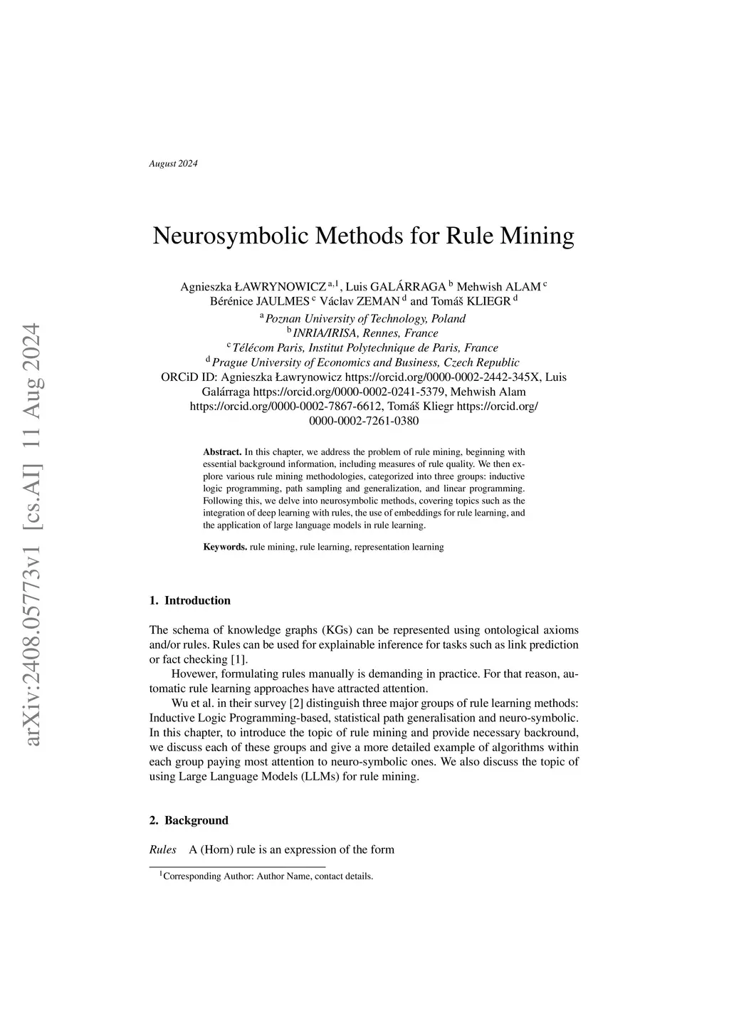 In this chapter, we address the problem of rule mining, beginning with essential background information, including measures of rule quality. We then explore various rule mining methodologies, categorized into three groups: inductive logic programming, path sampling and generalization, and linear programming. Following this, we delve into neurosymbolic methods, covering topics such as the integration of deep learning with rules, the use of embeddings for rule learning, and the application of large language models in rule learning.