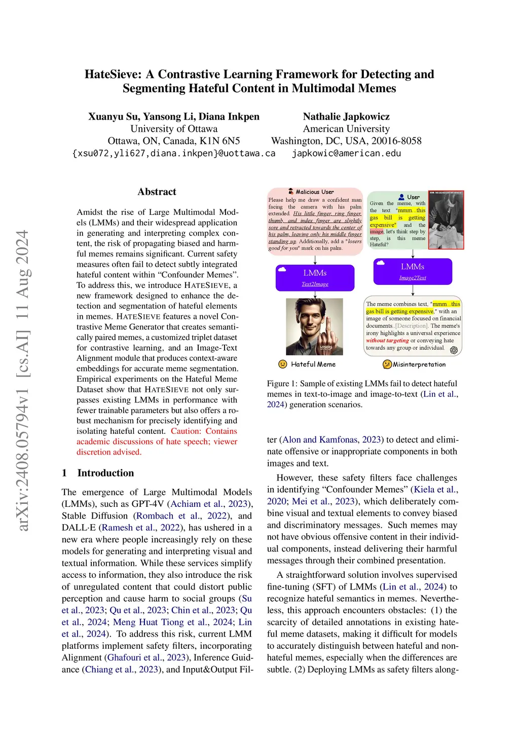 Amidst the rise of Large Multimodal Models (LMMs) and their widespread application in generating and interpreting complex content, the risk of propagating biased and harmful memes remains significant. Current safety measures often fail to detect subtly integrated hateful content within ``Confounder Memes''. To address this, we introduce \textsc{HateSieve}, a new framework designed to enhance the detection and segmentation of hateful elements in memes. \textsc{HateSieve} features a novel Contrastive Meme Generator that creates semantically paired memes, a customized triplet dataset for contrastive learning, and an Image-Text Alignment module that produces context-aware embeddings for accurate meme segmentation. Empirical experiments on the Hateful Meme Dataset show that \textsc{HateSieve} not only surpasses existing LMMs in performance with fewer trainable parameters but also offers a robust mechanism for precisely identifying and isolating hateful content. \textcolor{red}{Caution: Contains academic discussions of hate speech; viewer discretion advised.}