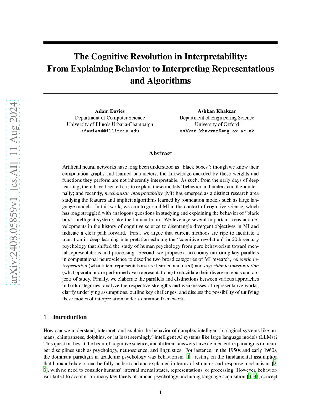 Artificial neural networks have long been understood as "black boxes": though we know their computation graphs and learned parameters, the knowledge encoded by these weights and functions they perform are not inherently interpretable. As such, from the early days of deep learning, there have been efforts to explain these models' behavior and understand them internally; and recently, mechanistic interpretability (MI) has emerged as a distinct research area studying the features and implicit algorithms learned by foundation models such as large language models. In this work, we aim to ground MI in the context of cognitive science, which has long struggled with analogous questions in studying and explaining the behavior of "black box" intelligent systems like the human brain. We leverage several important ideas and developments in the history of cognitive science to disentangle divergent objectives in MI and indicate a clear path forward. First, we argue that current methods are ripe to facilitate a transition in deep learning interpretation echoing the "cognitive revolution" in 20th-century psychology that shifted the study of human psychology from pure behaviorism toward mental representations and processing. Second, we propose a taxonomy mirroring key parallels in computational neuroscience to describe two broad categories of MI research, semantic interpretation (what latent representations are learned and used) and algorithmic interpretation (what operations are performed over representations) to elucidate their divergent goals and objects of study. Finally, we elaborate the parallels and distinctions between various approaches in both categories, analyze the respective strengths and weaknesses of representative works, clarify underlying assumptions, outline key challenges, and discuss the possibility of unifying these modes of interpretation under a common framework.