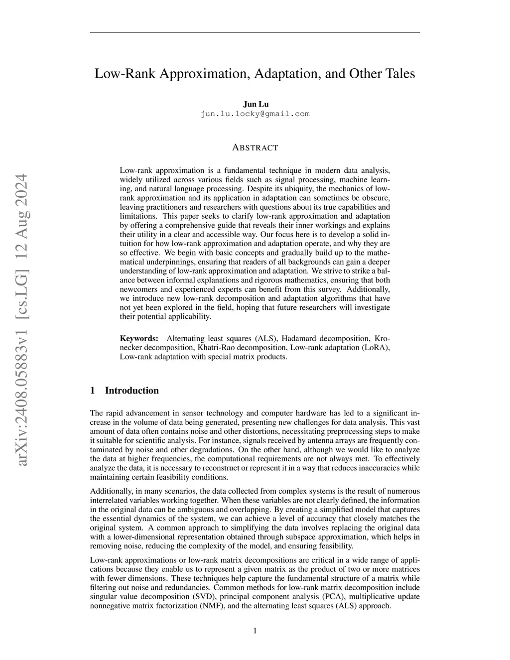 Low-rank approximation is a fundamental technique in modern data analysis, widely utilized across various fields such as signal processing, machine learning, and natural language processing. Despite its ubiquity, the mechanics of low-rank approximation and its application in adaptation can sometimes be obscure, leaving practitioners and researchers with questions about its true capabilities and limitations. This paper seeks to clarify low-rank approximation and adaptation by offering a comprehensive guide that reveals their inner workings and explains their utility in a clear and accessible way. Our focus here is to develop a solid intuition for how low-rank approximation and adaptation operate, and why they are so effective. We begin with basic concepts and gradually build up to the mathematical underpinnings, ensuring that readers of all backgrounds can gain a deeper understanding of low-rank approximation and adaptation. We strive to strike a balance between informal explanations and rigorous mathematics, ensuring that both newcomers and experienced experts can benefit from this survey. Additionally, we introduce new low-rank decomposition and adaptation algorithms that have not yet been explored in the field, hoping that future researchers will investigate their potential applicability.