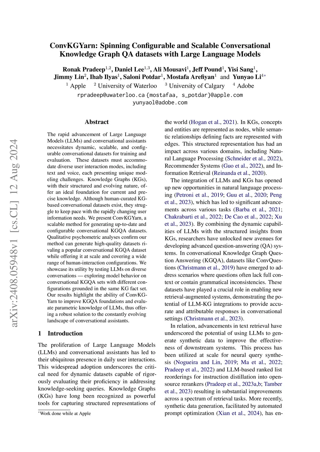 The rapid advancement of Large Language Models (LLMs) and conversational assistants necessitates dynamic, scalable, and configurable conversational datasets for training and evaluation. These datasets must accommodate diverse user interaction modes, including text and voice, each presenting unique modeling challenges. Knowledge Graphs (KGs), with their structured and evolving nature, offer an ideal foundation for current and precise knowledge. Although human-curated KG-based conversational datasets exist, they struggle to keep pace with the rapidly changing user information needs. We present ConvKGYarn, a scalable method for generating up-to-date and configurable conversational KGQA datasets. Qualitative psychometric analyses confirm our method can generate high-quality datasets rivaling a popular conversational KGQA dataset while offering it at scale and covering a wide range of human-interaction configurations. We showcase its utility by testing LLMs on diverse conversations - exploring model behavior on conversational KGQA sets with different configurations grounded in the same KG fact set. Our results highlight the ability of ConvKGYarn to improve KGQA foundations and evaluate parametric knowledge of LLMs, thus offering a robust solution to the constantly evolving landscape of conversational assistants.