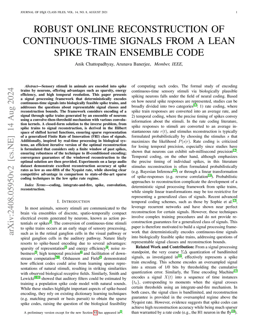 Sensory stimuli in animals are encoded into spike trains by neurons, offering advantages such as sparsity, energy efficiency, and high temporal resolution. This paper presents a signal processing framework that deterministically encodes continuous-time signals into biologically feasible spike trains, and addresses the questions about representable signal classes and reconstruction bounds. The framework considers encoding of a signal through spike trains generated by an ensemble of neurons using a convolve-then-threshold mechanism with various convolution kernels. A closed-form solution to the inverse problem, from spike trains to signal reconstruction, is derived in the Hilbert space of shifted kernel functions, ensuring sparse representation of a generalized Finite Rate of Innovation (FRI) class of signals. Additionally, inspired by real-time processing in biological systems, an efficient iterative version of the optimal reconstruction is formulated that considers only a finite window of past spikes, ensuring robustness of the technique to ill-conditioned encoding; convergence guarantees of the windowed reconstruction to the optimal solution are then provided. Experiments on a large audio dataset demonstrate excellent reconstruction accuracy at spike rates as low as one-fifth of the Nyquist rate, while showing clear competitive advantage in comparison to state-of-the-art sparse coding techniques in the low spike rate regime.