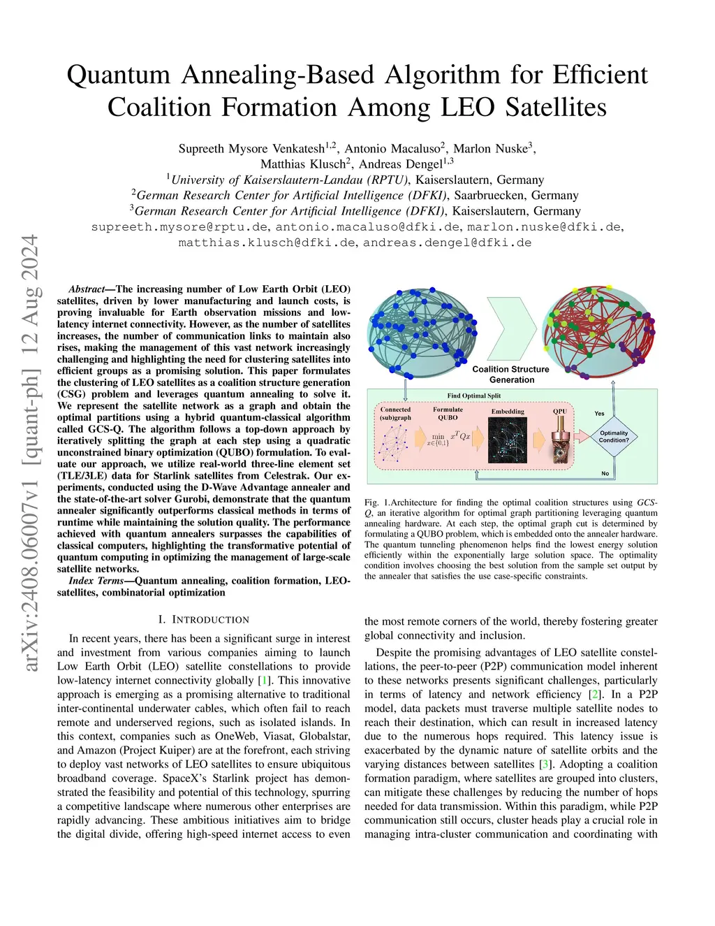 The increasing number of Low Earth Orbit (LEO) satellites, driven by lower manufacturing and launch costs, is proving invaluable for Earth observation missions and low-latency internet connectivity. However, as the number of satellites increases, the number of communication links to maintain also rises, making the management of this vast network increasingly challenging and highlighting the need for clustering satellites into efficient groups as a promising solution. This paper formulates the clustering of LEO satellites as a coalition structure generation (CSG) problem and leverages quantum annealing to solve it. We represent the satellite network as a graph and obtain the optimal partitions using a hybrid quantum-classical algorithm called GCS-Q. The algorithm follows a top-down approach by iteratively splitting the graph at each step using a quadratic unconstrained binary optimization (QUBO) formulation. To evaluate our approach, we utilize real-world three-line element set (TLE/3LE) data for Starlink satellites from Celestrak. Our experiments, conducted using the D-Wave Advantage annealer and the state-of-the-art solver Gurobi, demonstrate that the quantum annealer significantly outperforms classical methods in terms of runtime while maintaining the solution quality. The performance achieved with quantum annealers surpasses the capabilities of classical computers, highlighting the transformative potential of quantum computing in optimizing the management of large-scale satellite networks.
