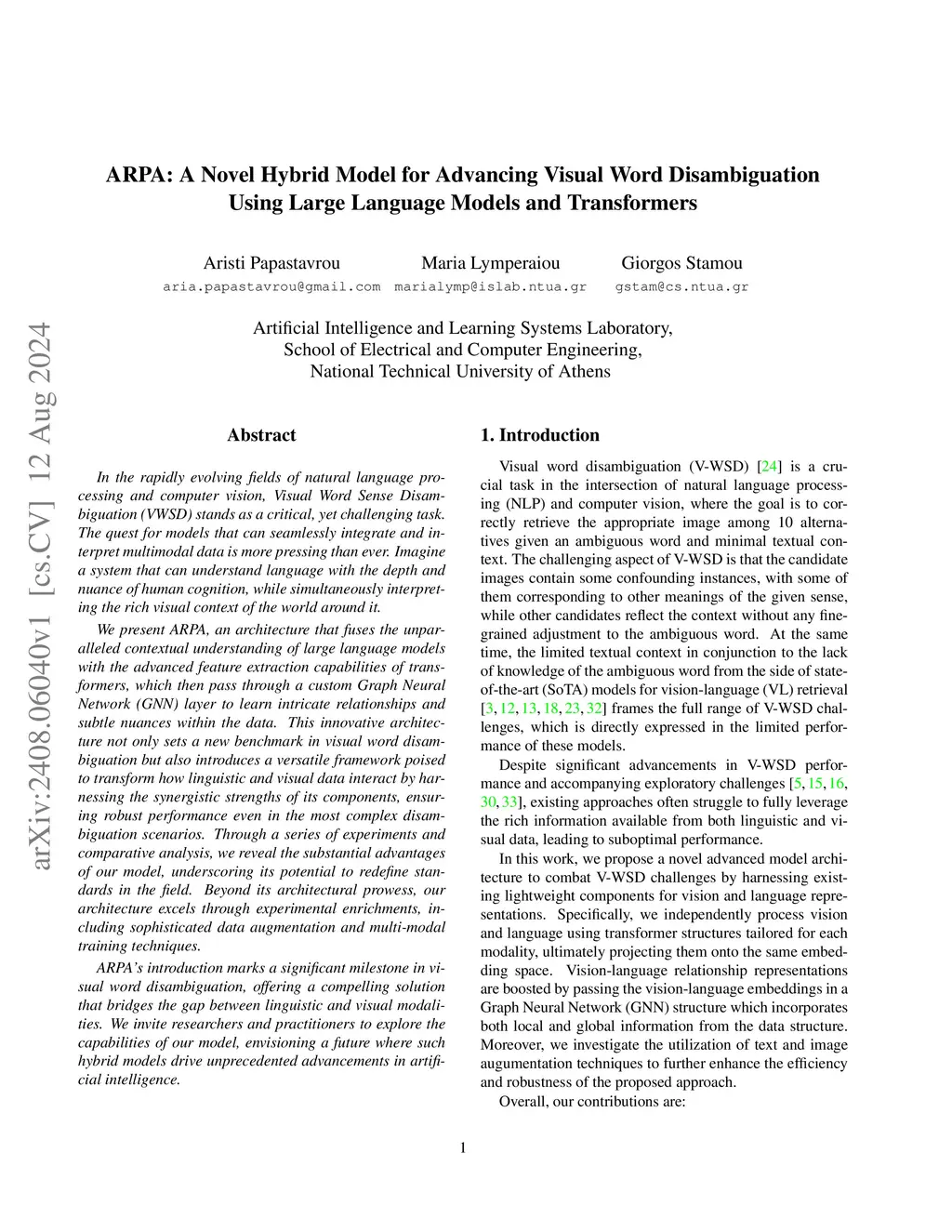In the rapidly evolving fields of natural language processing and computer vision, Visual Word Sense Disambiguation (VWSD) stands as a critical, yet challenging task. The quest for models that can seamlessly integrate and interpret multimodal data is more pressing than ever. Imagine a system that can understand language with the depth and nuance of human cognition, while simultaneously interpreting the rich visual context of the world around it. We present ARPA, an architecture that fuses the unparalleled contextual understanding of large language models with the advanced feature extraction capabilities of transformers, which then pass through a custom Graph Neural Network (GNN) layer to learn intricate relationships and subtle nuances within the data. This innovative architecture not only sets a new benchmark in visual word disambiguation but also introduces a versatile framework poised to transform how linguistic and visual data interact by harnessing the synergistic strengths of its components, ensuring robust performance even in the most complex disambiguation scenarios. Through a series of experiments and comparative analysis, we reveal the substantial advantages of our model, underscoring its potential to redefine standards in the field. Beyond its architectural prowess, our architecture excels through experimental enrichments, including sophisticated data augmentation and multi-modal training techniques. ARPA's introduction marks a significant milestone in visual word disambiguation, offering a compelling solution that bridges the gap between linguistic and visual modalities. We invite researchers and practitioners to explore the capabilities of our model, envisioning a future where such hybrid models drive unprecedented advancements in artificial intelligence.