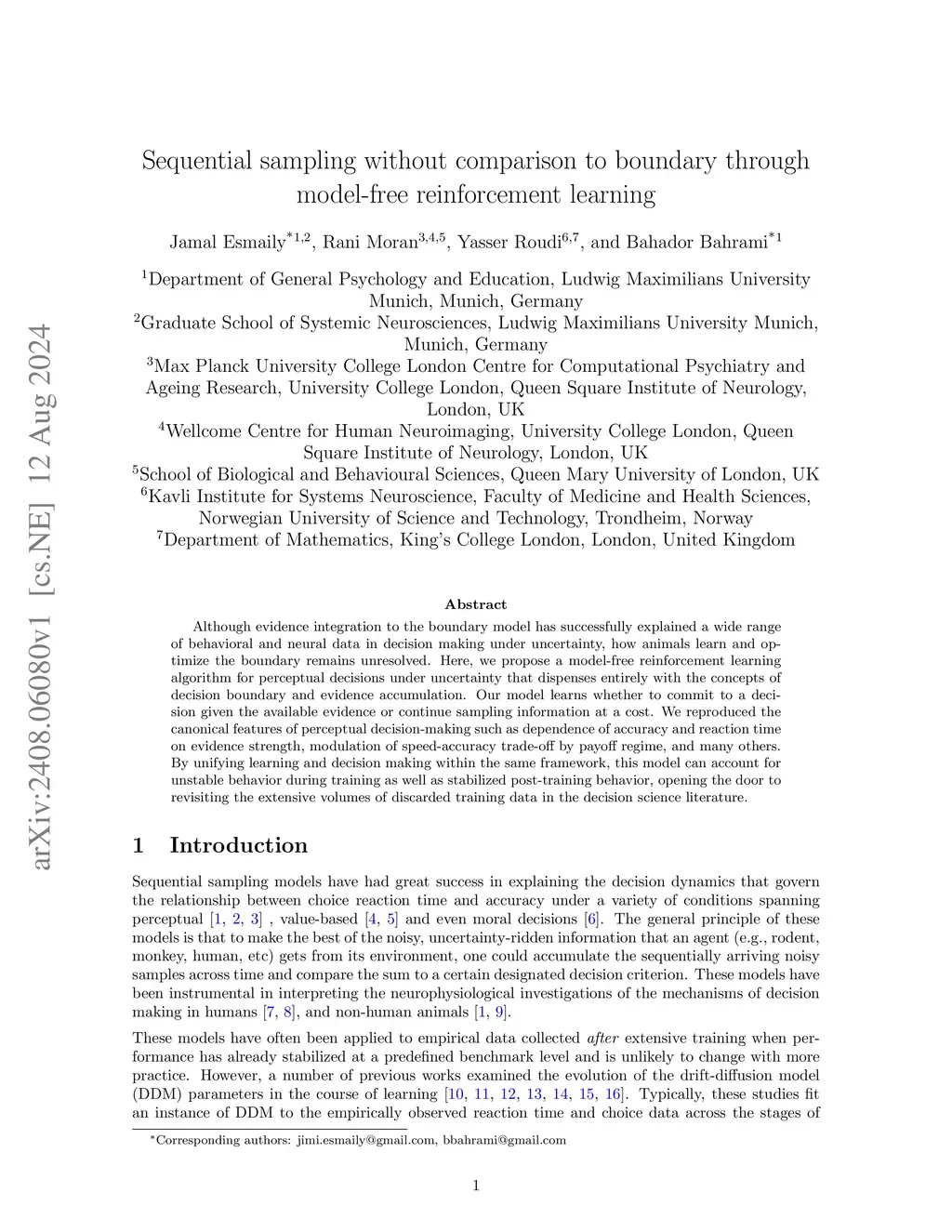 Although evidence integration to the boundary model has successfully explained a wide range of behavioral and neural data in decision making under uncertainty, how animals learn and optimize the boundary remains unresolved. Here, we propose a model-free reinforcement learning algorithm for perceptual decisions under uncertainty that dispenses entirely with the concepts of decision boundary and evidence accumulation. Our model learns whether to commit to a decision given the available evidence or continue sampling information at a cost. We reproduced the canonical features of perceptual decision-making such as dependence of accuracy and reaction time on evidence strength, modulation of speed-accuracy trade-off by payoff regime, and many others. By unifying learning and decision making within the same framework, this model can account for unstable behavior during training as well as stabilized post-training behavior, opening the door to revisiting the extensive volumes of discarded training data in the decision science literature.