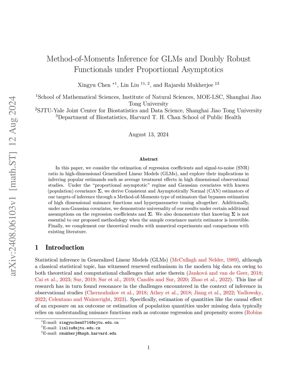 In this paper, we consider the estimation of regression coefficients and signal-to-noise (SNR) ratio in high-dimensional Generalized Linear Models (GLMs), and explore their implications in inferring popular estimands such as average treatment effects in high-dimensional observational studies. Under the ``proportional asymptotic'' regime and Gaussian covariates with known (population) covariance , we derive Consistent and Asymptotically Normal (CAN) estimators of our targets of inference through a Method-of-Moments type of estimators that bypasses estimation of high dimensional nuisance functions and hyperparameter tuning altogether. Additionally, under non-Gaussian covariates, we demonstrate universality of our results under certain additional assumptions on the regression coefficients and . We also demonstrate that knowing is not essential to our proposed methodology when the sample covariance matrix estimator is invertible. Finally, we complement our theoretical results with numerical experiments and comparisons with existing literature.