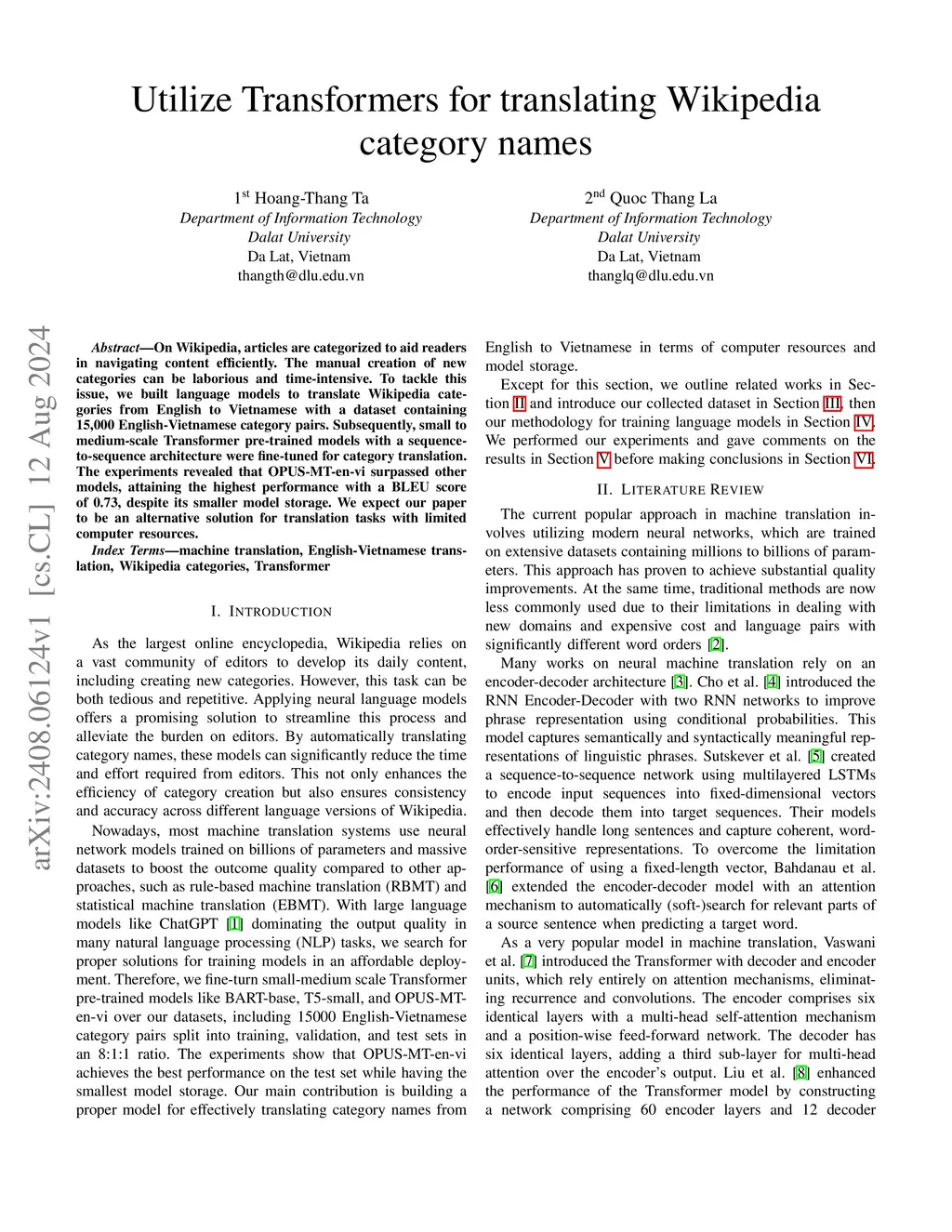 On Wikipedia, articles are categorized to aid readers in navigating content efficiently. The manual creation of new categories can be laborious and time-intensive. To tackle this issue, we built language models to translate Wikipedia categories from English to Vietnamese with a dataset containing 15,000 English-Vietnamese category pairs. Subsequently, small to medium-scale Transformer pre-trained models with a sequence-to-sequence architecture were fine-tuned for category translation. The experiments revealed that OPUS-MT-en-vi surpassed other models, attaining the highest performance with a BLEU score of 0.73, despite its smaller model storage. We expect our paper to be an alternative solution for translation tasks with limited computer resources.