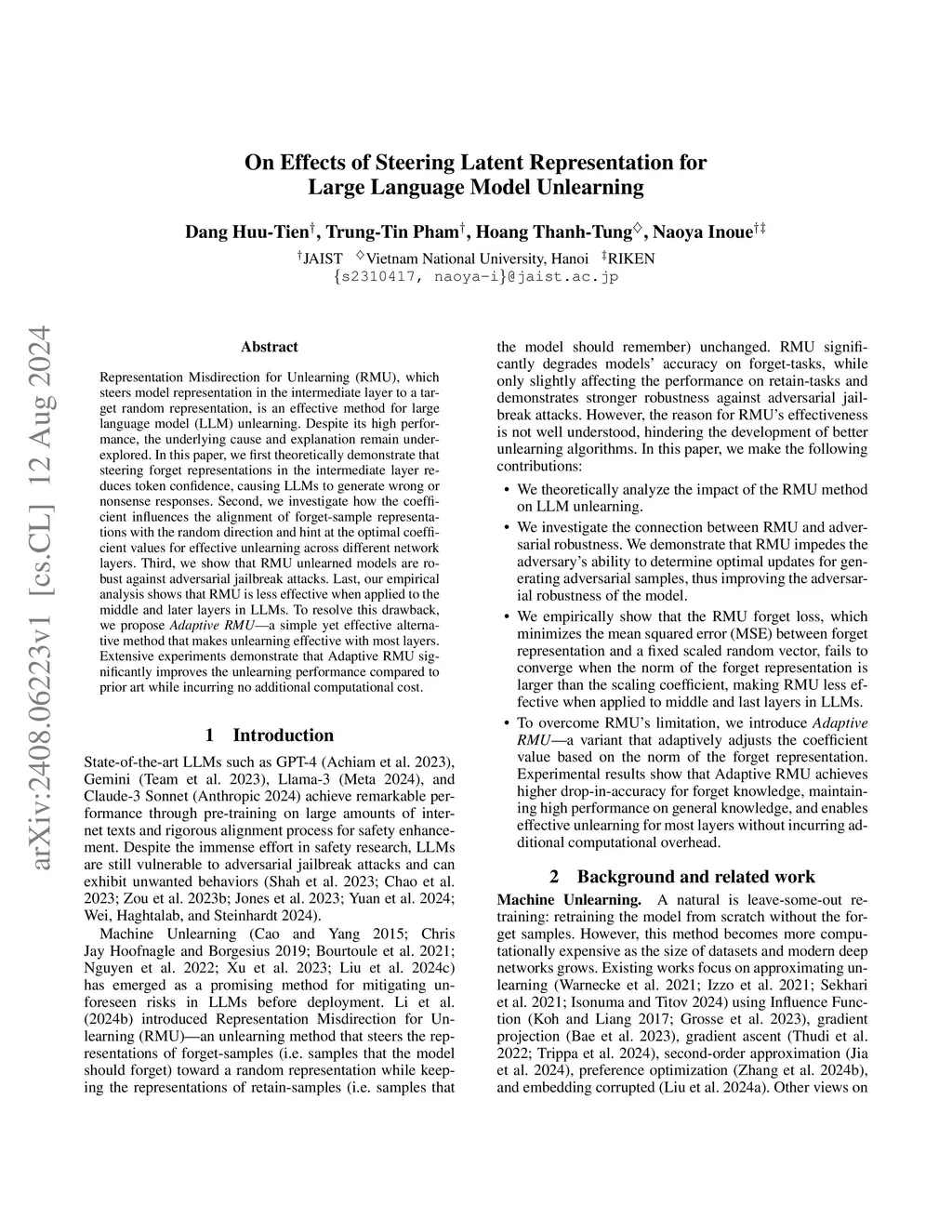 Representation Misdirection for Unlearning (RMU), which steers model representation in the intermediate layer to a target random representation, is an effective method for large language model (LLM) unlearning. Despite its high performance, the underlying cause and explanation remain underexplored. In this paper, we theoretically demonstrate that steering forget representations in the intermediate layer reduces token confidence, causing LLMs to generate wrong or nonsense responses. We investigate how the coefficient influences the alignment of forget-sample representations with the random direction and hint at the optimal coefficient values for effective unlearning across different network layers. We show that RMU unlearned models are robust against adversarial jailbreak attacks. Furthermore, our empirical analysis shows that RMU is less effective when applied to the middle and later layers in LLMs. To resolve this drawback, we propose Adaptive RMU--a simple yet effective alternative method that makes unlearning effective with most layers. Extensive experiments demonstrate that Adaptive RMU significantly improves the unlearning performance compared to prior art while incurring no additional computational cost.