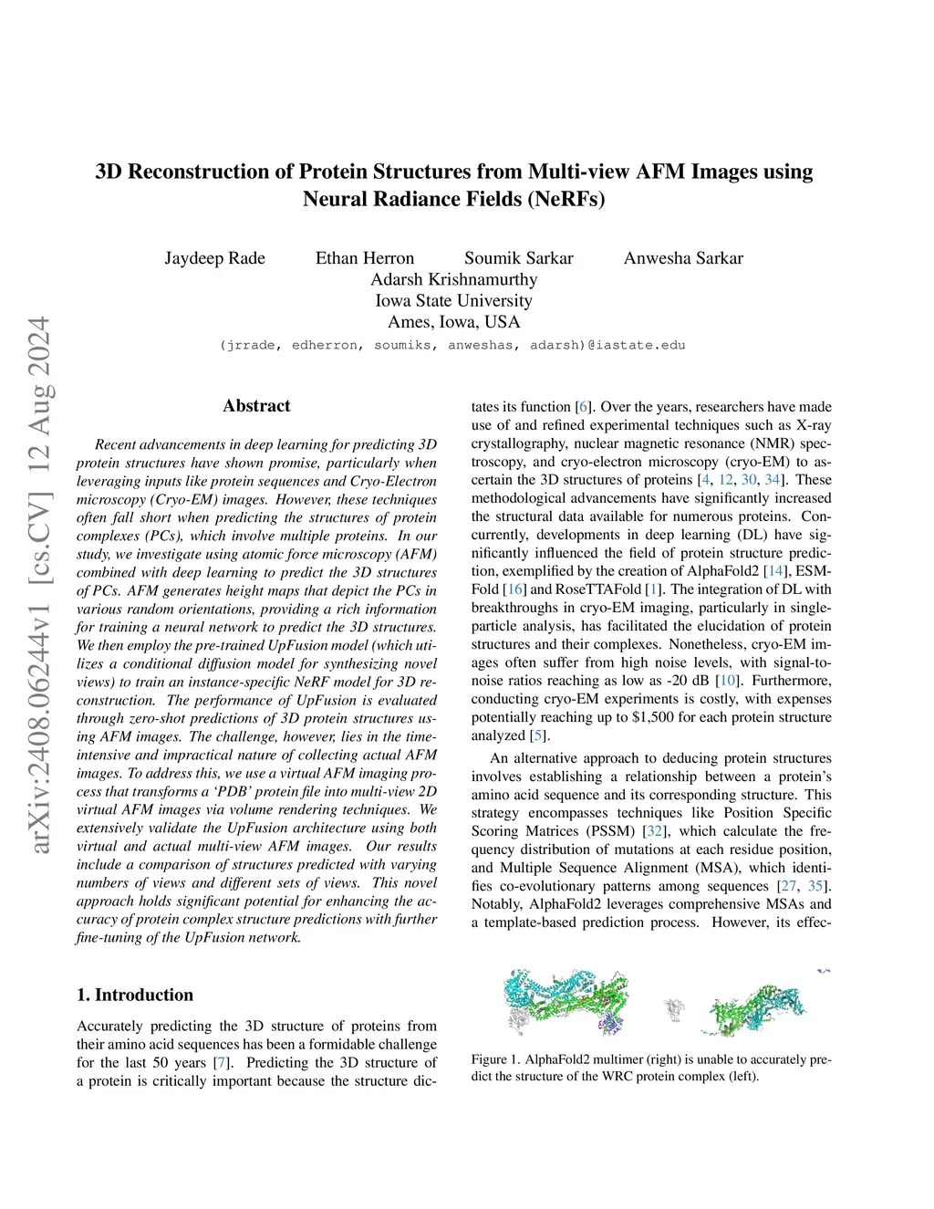 Recent advancements in deep learning for predicting 3D protein structures have shown promise, particularly when leveraging inputs like protein sequences and Cryo-Electron microscopy (Cryo-EM) images. However, these techniques often fall short when predicting the structures of protein complexes (PCs), which involve multiple proteins. In our study, we investigate using atomic force microscopy (AFM) combined with deep learning to predict the 3D structures of PCs. AFM generates height maps that depict the PCs in various random orientations, providing a rich information for training a neural network to predict the 3D structures. We then employ the pre-trained UpFusion model (which utilizes a conditional diffusion model for synthesizing novel views) to train an instance-specific NeRF model for 3D reconstruction. The performance of UpFusion is evaluated through zero-shot predictions of 3D protein structures using AFM images. The challenge, however, lies in the time-intensive and impractical nature of collecting actual AFM images. To address this, we use a virtual AFM imaging process that transforms a `PDB' protein file into multi-view 2D virtual AFM images via volume rendering techniques. We extensively validate the UpFusion architecture using both virtual and actual multi-view AFM images. Our results include a comparison of structures predicted with varying numbers of views and different sets of views. This novel approach holds significant potential for enhancing the accuracy of protein complex structure predictions with further fine-tuning of the UpFusion network.