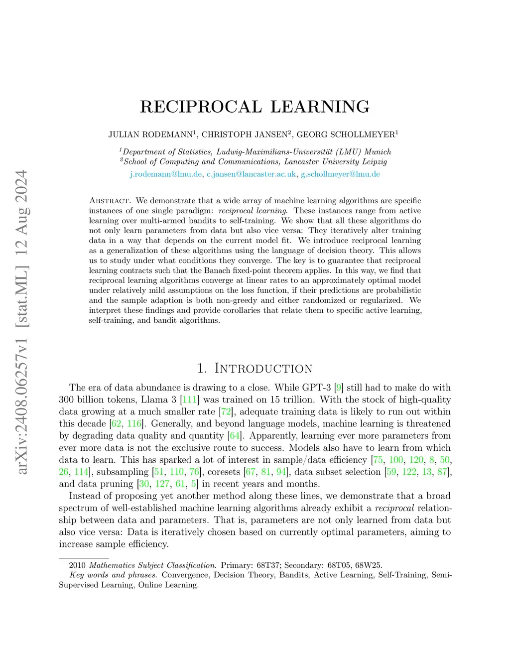 We demonstrate that a wide array of machine learning algorithms are specific instances of one single paradigm: reciprocal learning. These instances range from active learning over multi-armed bandits to self-training. We show that all these algorithms do not only learn parameters from data but also vice versa: They iteratively alter training data in a way that depends on the current model fit. We introduce reciprocal learning as a generalization of these algorithms using the language of decision theory. This allows us to study under what conditions they converge. The key is to guarantee that reciprocal learning contracts such that the Banach fixed-point theorem applies. In this way, we find that reciprocal learning algorithms converge at linear rates to an approximately optimal model under relatively mild assumptions on the loss function, if their predictions are probabilistic and the sample adaption is both non-greedy and either randomized or regularized. We interpret these findings and provide corollaries that relate them to specific active learning, self-training, and bandit algorithms.