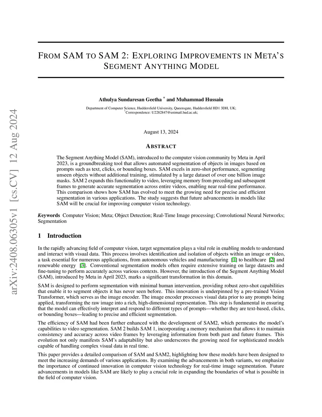 The Segment Anything Model (SAM), introduced to the computer vision community by Meta in April 2023, is a groundbreaking tool that allows automated segmentation of objects in images based on prompts such as text, clicks, or bounding boxes. SAM excels in zero-shot performance, segmenting unseen objects without additional training, stimulated by a large dataset of over one billion image masks. SAM 2 expands this functionality to video, leveraging memory from preceding and subsequent frames to generate accurate segmentation across entire videos, enabling near real-time performance. This comparison shows how SAM has evolved to meet the growing need for precise and efficient segmentation in various applications. The study suggests that future advancements in models like SAM will be crucial for improving computer vision technology.