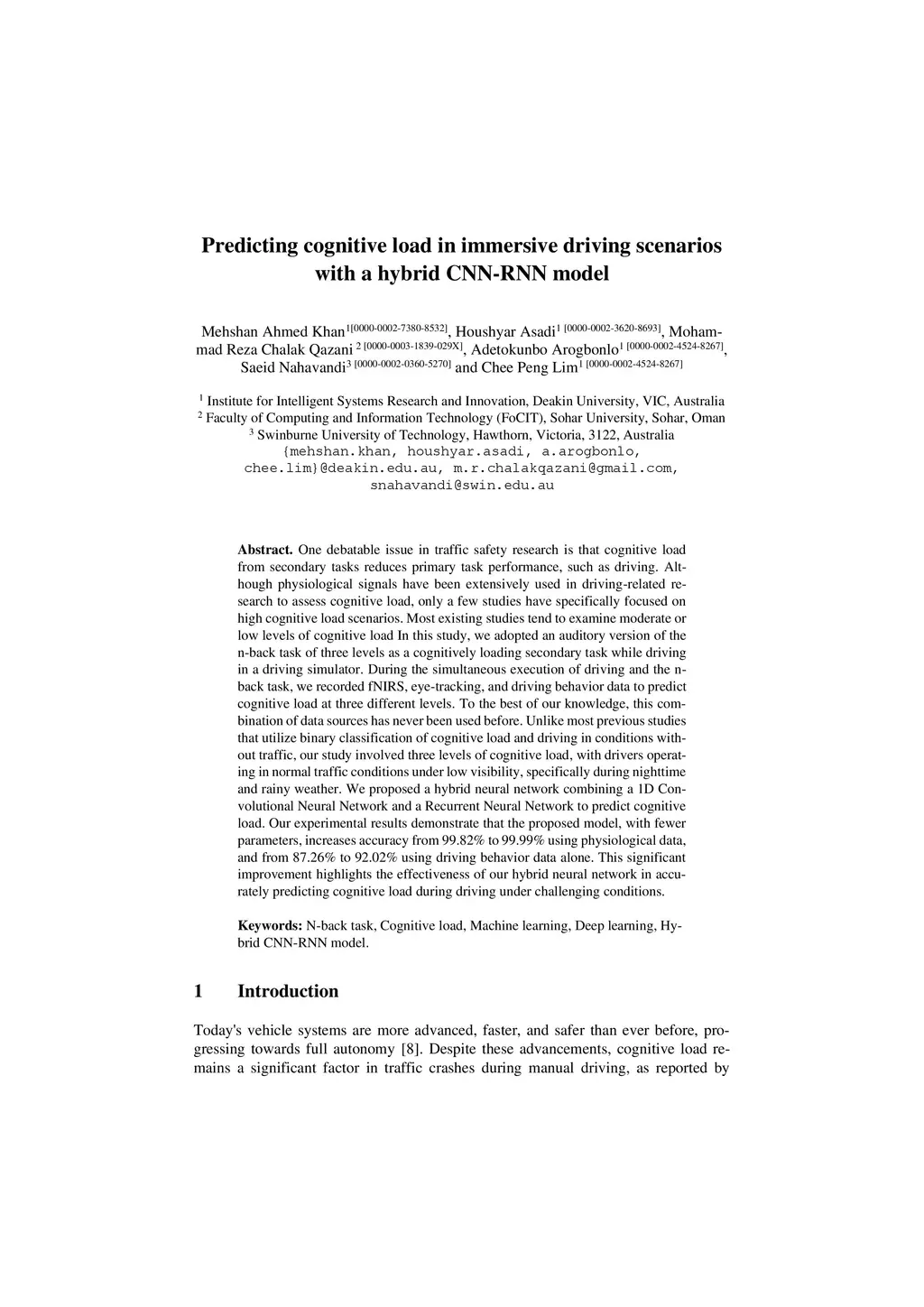 One debatable issue in traffic safety research is that cognitive load from sec-ondary tasks reduces primary task performance, such as driving. Although physiological signals have been extensively used in driving-related research to assess cognitive load, only a few studies have specifically focused on high cognitive load scenarios. Most existing studies tend to examine moderate or low levels of cognitive load In this study, we adopted an auditory version of the n-back task of three levels as a cognitively loading secondary task while driving in a driving simulator. During the simultaneous execution of driving and the n-back task, we recorded fNIRS, eye-tracking, and driving behavior data to predict cognitive load at three different levels. To the best of our knowledge, this combination of data sources has never been used before. Un-like most previous studies that utilize binary classification of cognitive load and driving in conditions without traffic, our study involved three levels of cognitive load, with drivers operating in normal traffic conditions under low visibility, specifically during nighttime and rainy weather. We proposed a hybrid neural network combining a 1D Convolutional Neural Network and a Recurrent Neural Network to predict cognitive load. Our experimental re-sults demonstrate that the proposed model, with fewer parameters, increases accuracy from 99.82% to 99.99% using physiological data, and from 87.26% to 92.02% using driving behavior data alone. This significant improvement highlights the effectiveness of our hybrid neural network in accurately pre-dicting cognitive load during driving under challenging conditions.