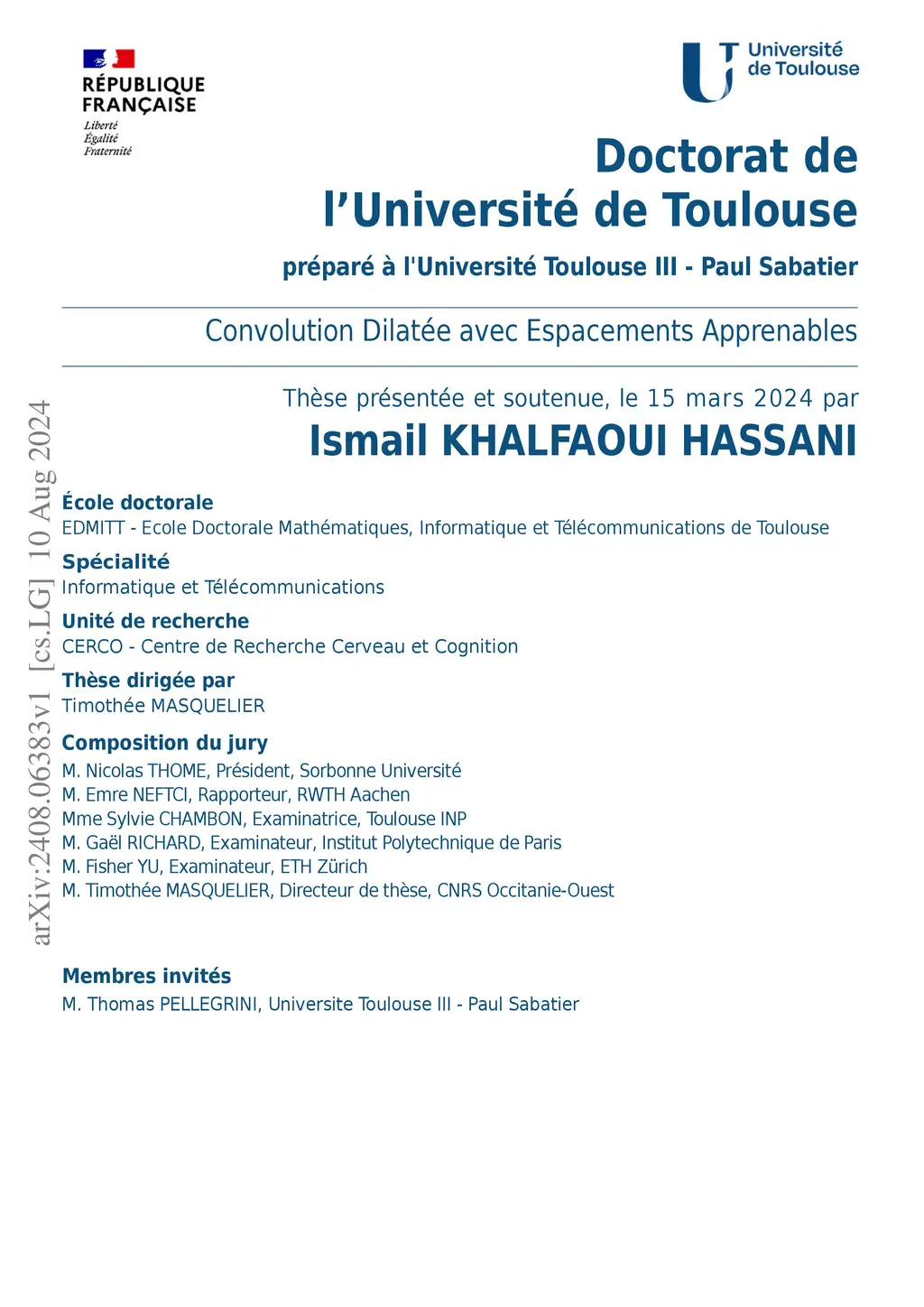 This thesis presents and evaluates the Dilated Convolution with Learnable Spacings (DCLS) method. Through various supervised learning experiments in the fields of computer vision, audio, and speech processing, the DCLS method proves to outperform both standard and advanced convolution techniques. The research is organized into several steps, starting with an analysis of the literature and existing convolution techniques that preceded the development of the DCLS method. We were particularly interested in the methods that are closely related to our own and that remain essential to capture the nuances and uniqueness of our approach. The cornerstone of our study is the introduction and application of the DCLS method to convolutional neural networks (CNNs), as well as to hybrid architectures that rely on both convolutional and visual attention approaches. DCLS is shown to be particularly effective in tasks such as classification, semantic segmentation, and object detection. Initially using bilinear interpolation, the study also explores other interpolation methods, finding that Gaussian interpolation slightly improves performance. The DCLS method is further applied to spiking neural networks (SNNs) to enable synaptic delay learning within a neural network that could eventually be transferred to so-called neuromorphic chips. The results show that the DCLS method stands out as a new state-of-the-art technique in SNN audio classification for certain benchmark tasks in this field. These tasks involve datasets with a high temporal component. In addition, we show that DCLS can significantly improve the accuracy of artificial neural networks for the multi-label audio classification task. We conclude with a discussion of the chosen experimental setup, its limitations, the limitations of our method, and our results.
