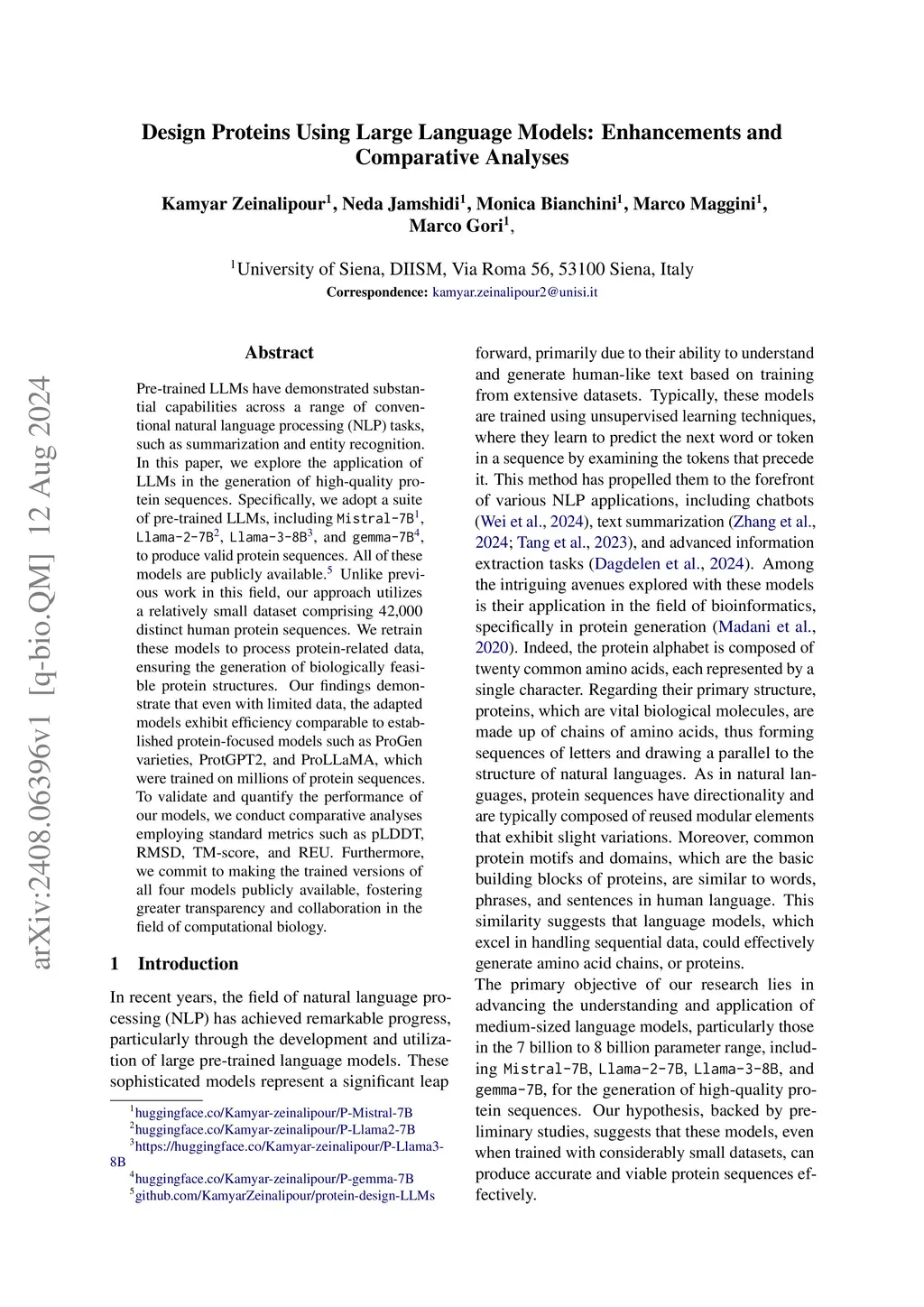 Pre-trained LLMs have demonstrated substantial capabilities across a range of conventional natural language processing (NLP) tasks, such as summarization and entity recognition. In this paper, we explore the application of LLMs in the generation of high-quality protein sequences. Specifically, we adopt a suite of pre-trained LLMs, including Mistral-7B1, Llama-2-7B2, Llama-3-8B3, and gemma-7B4, to produce valid protein sequences. All of these models are publicly available.5 Unlike previous work in this field, our approach utilizes a relatively small dataset comprising 42,000 distinct human protein sequences. We retrain these models to process protein-related data, ensuring the generation of biologically feasible protein structures. Our findings demonstrate that even with limited data, the adapted models exhibit efficiency comparable to established protein-focused models such as ProGen varieties, ProtGPT2, and ProLLaMA, which were trained on millions of protein sequences. To validate and quantify the performance of our models, we conduct comparative analyses employing standard metrics such as pLDDT, RMSD, TM-score, and REU. Furthermore, we commit to making the trained versions of all four models publicly available, fostering greater transparency and collaboration in the field of computational biology.