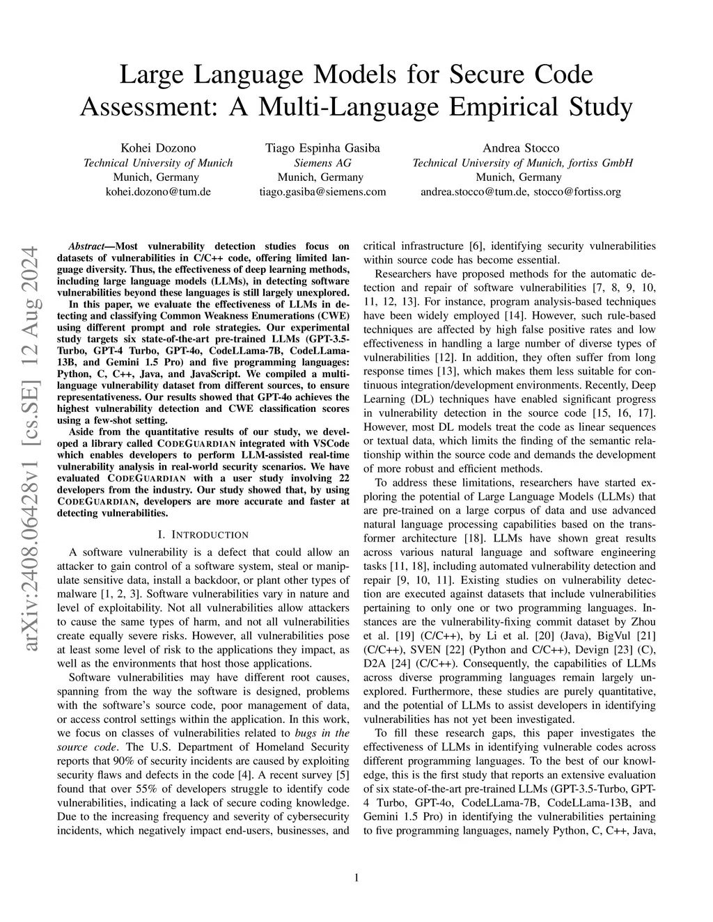Most vulnerability detection studies focus on datasets of vulnerabilities in C/C++ code, offering limited language diversity. Thus, the effectiveness of deep learning methods, including large language models (LLMs), in detecting software vulnerabilities beyond these languages is still largely unexplored. In this paper, we evaluate the effectiveness of LLMs in detecting and classifying Common Weakness Enumerations (CWE) using different prompt and role strategies. Our experimental study targets six state-of-the-art pre-trained LLMs (GPT-3.5- Turbo, GPT-4 Turbo, GPT-4o, CodeLLama-7B, CodeLLama- 13B, and Gemini 1.5 Pro) and five programming languages: Python, C, C++, Java, and JavaScript. We compiled a multi-language vulnerability dataset from different sources, to ensure representativeness. Our results showed that GPT-4o achieves the highest vulnerability detection and CWE classification scores using a few-shot setting. Aside from the quantitative results of our study, we developed a library called CODEGUARDIAN integrated with VSCode which enables developers to perform LLM-assisted real-time vulnerability analysis in real-world security scenarios. We have evaluated CODEGUARDIAN with a user study involving 22 developers from the industry. Our study showed that, by using CODEGUARDIAN, developers are more accurate and faster at detecting vulnerabilities.
