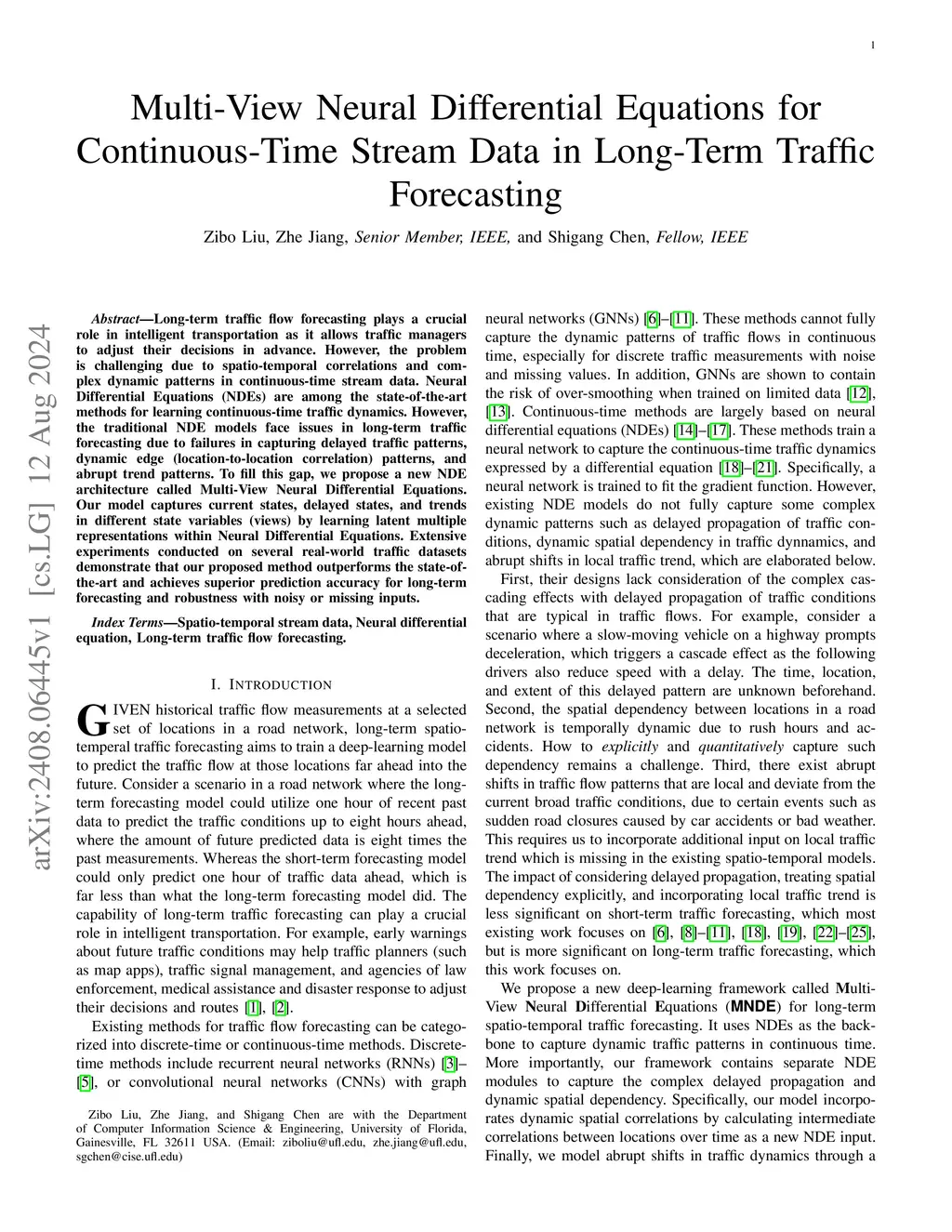 Long-term traffic flow forecasting plays a crucial role in intelligent transportation as it allows traffic managers to adjust their decisions in advance. However, the problem is challenging due to spatio-temporal correlations and complex dynamic patterns in continuous-time stream data. Neural Differential Equations (NDEs) are among the state-of-the-art methods for learning continuous-time traffic dynamics. However, the traditional NDE models face issues in long-term traffic forecasting due to failures in capturing delayed traffic patterns, dynamic edge (location-to-location correlation) patterns, and abrupt trend patterns. To fill this gap, we propose a new NDE architecture called Multi-View Neural Differential Equations. Our model captures current states, delayed states, and trends in different state variables (views) by learning latent multiple representations within Neural Differential Equations. Extensive experiments conducted on several real-world traffic datasets demonstrate that our proposed method outperforms the state-of-the-art and achieves superior prediction accuracy for long-term forecasting and robustness with noisy or missing inputs.