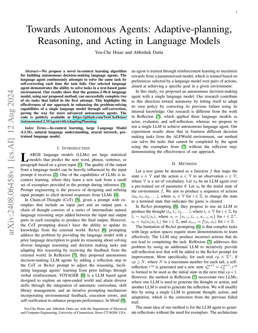 We propose a novel in-context learning algorithm for building autonomous decision-making language agents. The language agent continuously attempts to solve the same task by self-correcting each time the task fails. Our selected language agent demonstrates the ability to solve tasks in a text-based game environment. Our results show that the gemma-2-9b-it language model, using our proposed method, can successfully complete two of six tasks that failed in the first attempt. This highlights the effectiveness of our approach in enhancing the problem-solving capabilities of a single language model through self-correction, paving the way for more advanced autonomous agents. The code is publicly available at https://github.com/YenCheHsiao/AutonomousLLMAgentwithAdaptingPlanning.