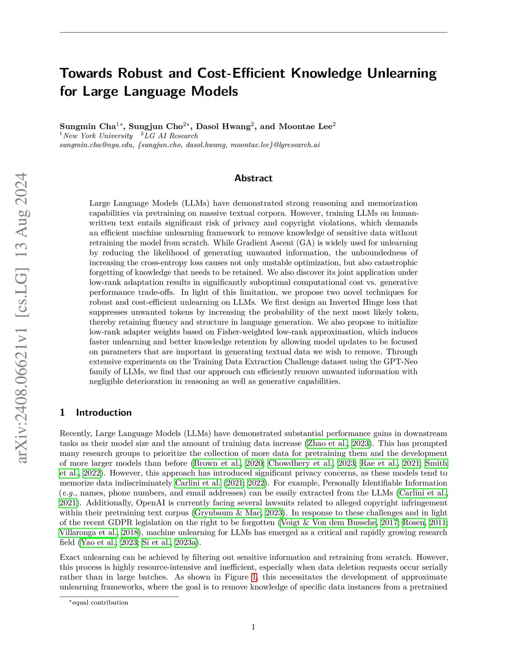 Large Language Models (LLMs) have demonstrated strong reasoning and memorization capabilities via pretraining on massive textual corpora. However, this poses risk of privacy and copyright violations, highlighting the need for efficient machine unlearning methods that remove sensitive data without retraining from scratch. While Gradient Ascent (GA) is commonly used to unlearn by reducing the likelihood of generating unwanted content, it leads to unstable optimization and catastrophic forgetting of retrained knowledge. We find that combining GA with low-rank adaptation results in poor trade-offs between computational cost and generative performance. To address these challenges, we propose Low-rank Knowledge Unlearning (LoKU), a novel framework that enables robust and efficient unlearning for LLMs. First, we introduce Inverted Hinge Loss, which suppresses unwanted tokens while maintaining fluency by boosting the probability of the next most likely token. Second, we develop a data-adaptive initialization for LoRA adapters via low-rank approximation weighted with relative Fisher information, thereby focusing updates on parameters critical for removing targeted knowledge. Experiments on the Training Data Extraction Challenge dataset using GPT-Neo models as well as on the TOFU benchmark with Phi-1.5B and Llama2-7B models demonstrate that our approach effectively removes sensitive information while maintaining reasoning and generative capabilities with minimal impact. Our implementation can be found inthis https URL.