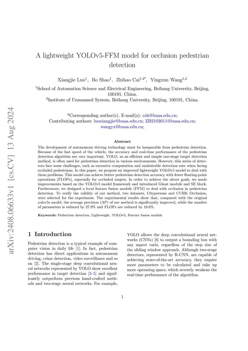 A lightweight YOLOv5-FFM model for occlusion pedestrian detection