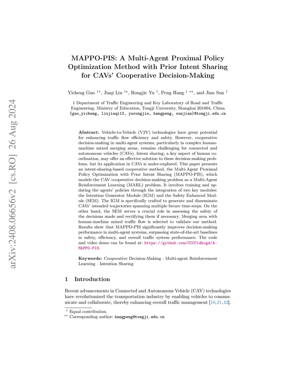Vehicle-to-Vehicle (V2V) technologies have great potential for enhancing traffic flow efficiency and safety. However, cooperative decision-making in multi-agent systems, particularly in complex human-machine mixed merging areas, remains challenging for connected and autonomous vehicles (CAVs). Intent sharing, a key aspect of human coordination, may offer an effective solution to these decision-making problems, but its application in CAVs is under-explored. This paper presents an intent-sharing-based cooperative method, the Multi-Agent Proximal Policy Optimization with Prior Intent Sharing (MAPPO-PIS), which models the CAV cooperative decision-making problem as a Multi-Agent Reinforcement Learning (MARL) problem. It involves training and updating the agents' policies through the integration of two key modules: the Intention Generator Module (IGM) and the Safety Enhanced Module (SEM). The IGM is specifically crafted to generate and disseminate CAVs' intended trajectories spanning multiple future time-steps. On the other hand, the SEM serves a crucial role in assessing the safety of the decisions made and rectifying them if necessary. Merging area with human-machine mixed traffic flow is selected to validate our method. Results show that MAPPO-PIS significantly improves decision-making performance in multi-agent systems, surpassing state-of-the-art baselines in safety, efficiency, and overall traffic system performance. The code and video demo can be found at: \url{https://github.com/CCCC1dhcgd/A-MAPPO-PIS}.