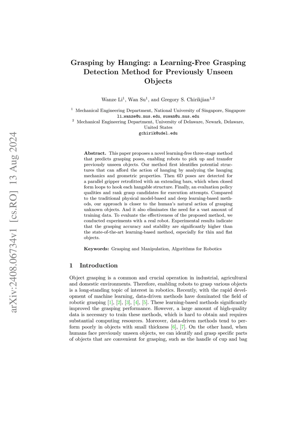 This paper proposes a novel learning-free three-stage method that predicts grasping poses, enabling robots to pick up and transfer previously unseen objects. Our method first identifies potential structures that can afford the action of hanging by analyzing the hanging mechanics and geometric properties. Then 6D poses are detected for a parallel gripper retrofitted with an extending bar, which when closed forms loops to hook each hangable structure. Finally, an evaluation policy qualities and rank grasp candidates for execution attempts. Compared to the traditional physical model-based and deep learning-based methods, our approach is closer to the human natural action of grasping unknown objects. And it also eliminates the need for a vast amount of training data. To evaluate the effectiveness of the proposed method, we conducted experiments with a real robot. Experimental results indicate that the grasping accuracy and stability are significantly higher than the state-of-the-art learning-based method, especially for thin and flat objects.