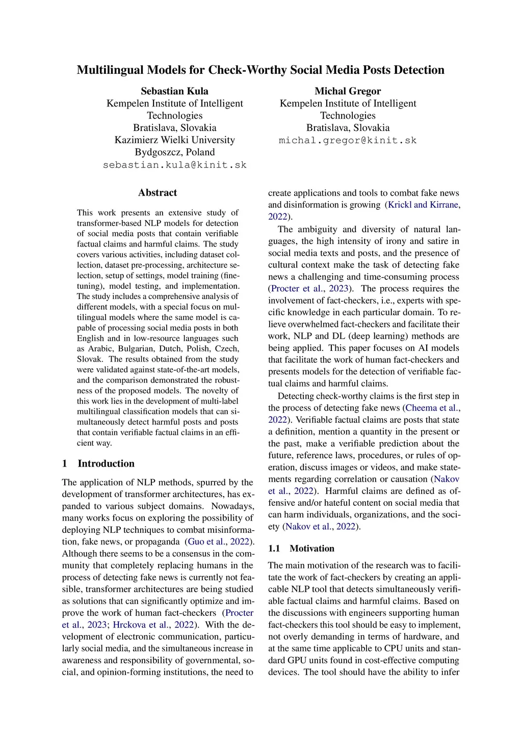 This work presents an extensive study of transformer-based NLP models for detection of social media posts that contain verifiable factual claims and harmful claims. The study covers various activities, including dataset collection, dataset pre-processing, architecture selection, setup of settings, model training (fine-tuning), model testing, and implementation. The study includes a comprehensive analysis of different models, with a special focus on multilingual models where the same model is capable of processing social media posts in both English and in low-resource languages such as Arabic, Bulgarian, Dutch, Polish, Czech, Slovak. The results obtained from the study were validated against state-of-the-art models, and the comparison demonstrated the robustness of the proposed models. The novelty of this work lies in the development of multi-label multilingual classification models that can simultaneously detect harmful posts and posts that contain verifiable factual claims in an efficient way.