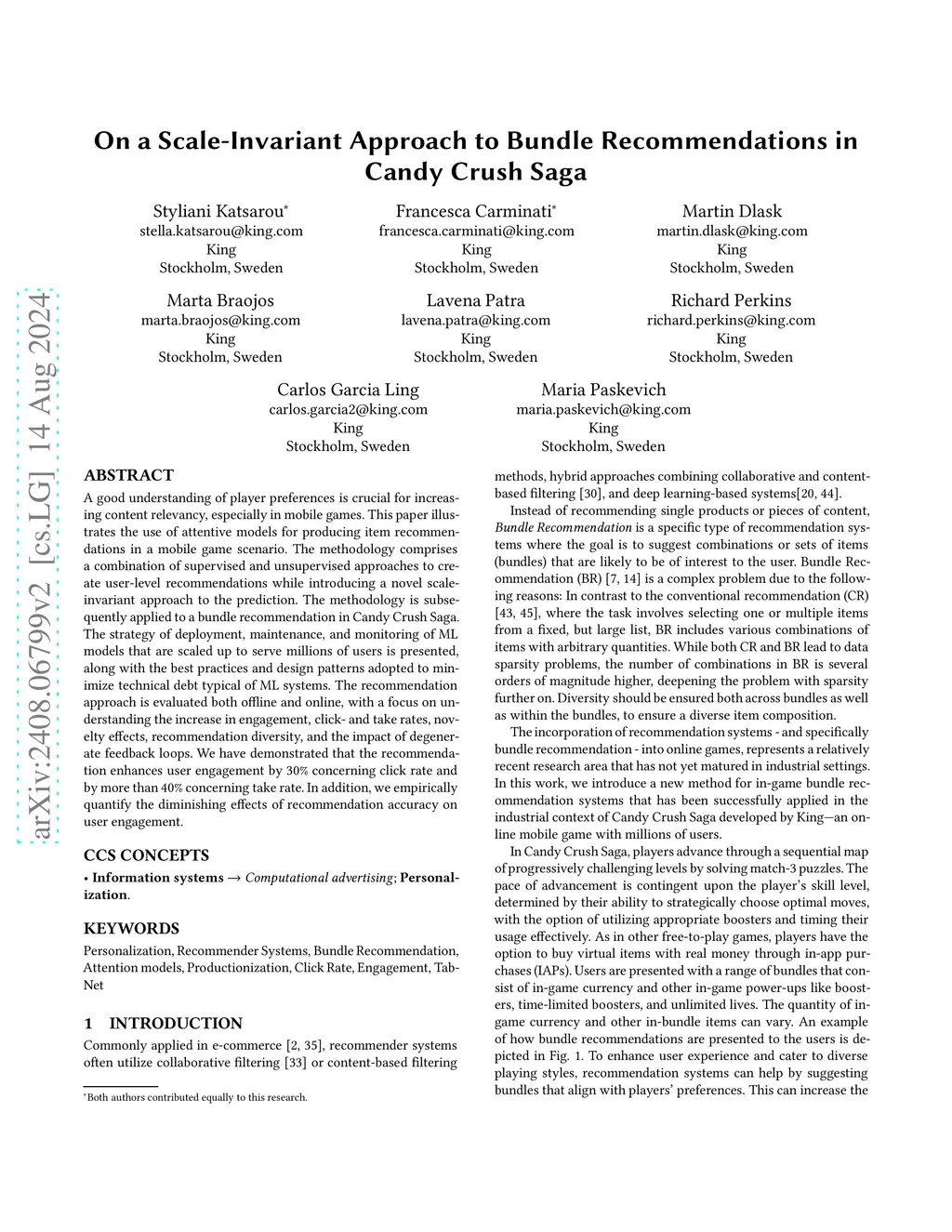 A good understanding of player preferences is crucial for increasing content relevancy, especially in mobile games. This paper illustrates the use of attentive models for producing item recommendations in a mobile game scenario. The methodology comprises a combination of supervised and unsupervised approaches to create user-level recommendations while introducing a novel scale-invariant approach to the prediction. The methodology is subsequently applied to a bundle recommendation in Candy Crush Saga. The strategy of deployment, maintenance, and monitoring of ML models that are scaled up to serve millions of users is presented, along with the best practices and design patterns adopted to minimize technical debt typical of ML systems. The recommendation approach is evaluated both offline and online, with a focus on understanding the increase in engagement, click- and take rates, novelty effects, recommendation diversity, and the impact of degenerate feedback loops. We have demonstrated that the recommendation enhances user engagement by 30% concerning click rate and by more than 40% concerning take rate. In addition, we empirically quantify the diminishing effects of recommendation accuracy on user engagement.