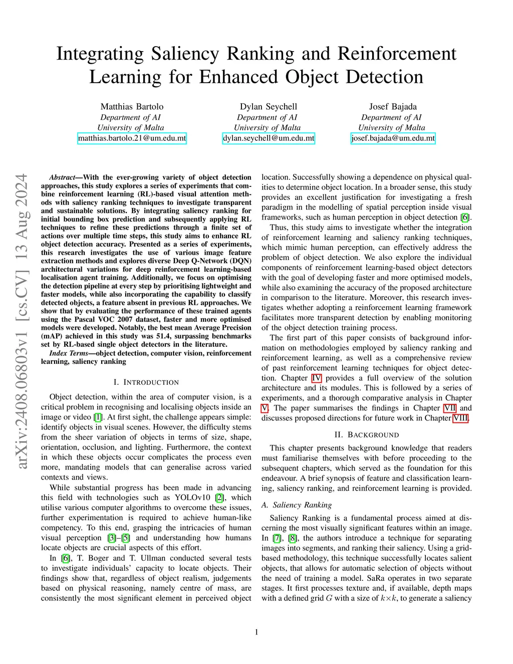 With the ever-growing variety of object detection approaches, this study explores a series of experiments that combine reinforcement learning (RL)-based visual attention methods with saliency ranking techniques to investigate transparent and sustainable solutions. By integrating saliency ranking for initial bounding box prediction and subsequently applying RL techniques to refine these predictions through a finite set of actions over multiple time steps, this study aims to enhance RL object detection accuracy. Presented as a series of experiments, this research investigates the use of various image feature extraction methods and explores diverse Deep Q-Network (DQN) architectural variations for deep reinforcement learning-based localisation agent training. Additionally, we focus on optimising the detection pipeline at every step by prioritising lightweight and faster models, while also incorporating the capability to classify detected objects, a feature absent in previous RL approaches. We show that by evaluating the performance of these trained agents using the Pascal VOC 2007 dataset, faster and more optimised models were developed. Notably, the best mean Average Precision (mAP) achieved in this study was 51.4, surpassing benchmarks set by RL-based single object detectors in the literature.