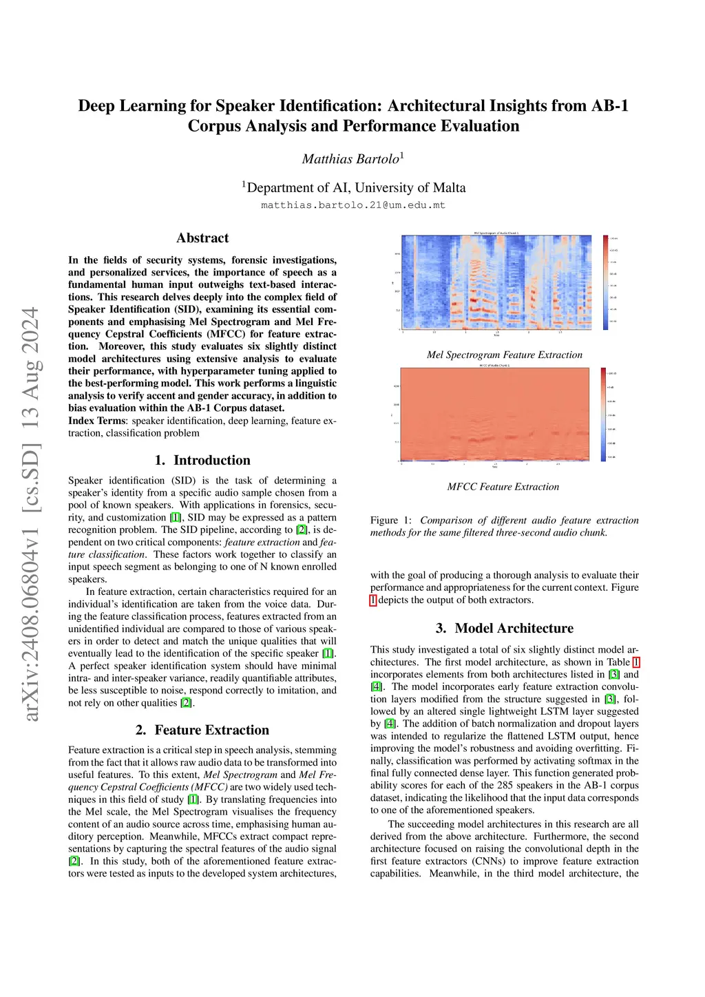 In the fields of security systems, forensic investigations, and personalized services, the importance of speech as a fundamental human input outweighs text-based interactions. This research delves deeply into the complex field of Speaker Identification (SID), examining its essential components and emphasising Mel Spectrogram and Mel Frequency Cepstral Coefficients (MFCC) for feature extraction. Moreover, this study evaluates six slightly distinct model architectures using extensive analysis to evaluate their performance, with hyperparameter tuning applied to the best-performing model. This work performs a linguistic analysis to verify accent and gender accuracy, in addition to bias evaluation within the AB-1 Corpus dataset.