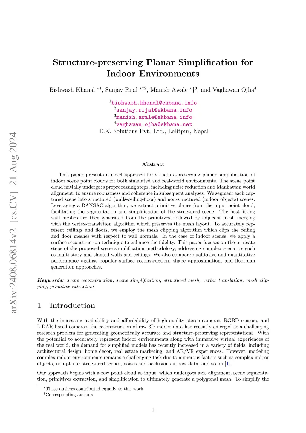 This paper presents a novel approach for structure-preserving planar simplification of indoor scene point clouds for both simulated and real-world environments. Initially, the scene point cloud undergoes preprocessing steps, including noise reduction and Manhattan world alignment, to ensure robustness and coherence in subsequent analyses. We segment each captured scene into structured (walls-ceiling-floor) and non-structured (indoor objects) scenes. Leveraging a RANSAC algorithm, we extract primitive planes from the input point cloud, facilitating the segmentation and simplification of the structured scene. The best-fitting wall meshes are then generated from the primitives, followed by adjacent mesh merging with the vertex-translation algorithm which preserves the mesh layout. To accurately represent ceilings and floors, we employ the mesh clipping algorithm which clips the ceiling and floor meshes with respect to wall normals. In the case of indoor scenes, we apply a surface reconstruction technique to enhance the fidelity. This paper focuses on the intricate steps of the proposed scene simplification methodology, addressing complex scenarios such as multi-story and slanted walls and ceilings. We also conduct qualitative and quantitative performance comparisons against popular surface reconstruction, shape approximation, and floorplan generation approaches.