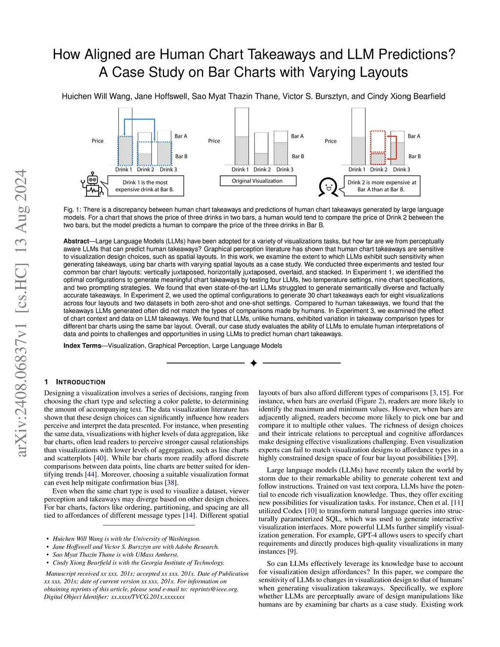 Large Language Models (LLMs) have been adopted for a variety of visualizations tasks, but how far are we from perceptually aware LLMs that can predict human takeaways? Graphical perception literature has shown that human chart takeaways are sensitive to visualization design choices, such as spatial layouts. In this work, we examine the extent to which LLMs exhibit such sensitivity when generating takeaways, using bar charts with varying spatial layouts as a case study. We conducted three experiments and tested four common bar chart layouts: vertically juxtaposed, horizontally juxtaposed, overlaid, and stacked. In Experiment 1, we identified the optimal configurations to generate meaningful chart takeaways by testing four LLMs, two temperature settings, nine chart specifications, and two prompting strategies. We found that even state-of-the-art LLMs struggled to generate semantically diverse and factually accurate takeaways. In Experiment 2, we used the optimal configurations to generate 30 chart takeaways each for eight visualizations across four layouts and two datasets in both zero-shot and one-shot settings. Compared to human takeaways, we found that the takeaways LLMs generated often did not match the types of comparisons made by humans. In Experiment 3, we examined the effect of chart context and data on LLM takeaways. We found that LLMs, unlike humans, exhibited variation in takeaway comparison types for different bar charts using the same bar layout. Overall, our case study evaluates the ability of LLMs to emulate human interpretations of data and points to challenges and opportunities in using LLMs to predict human chart takeaways.