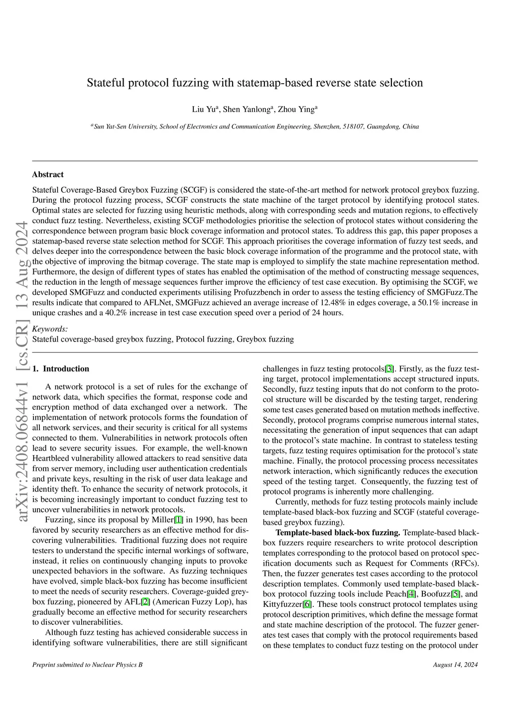 Stateful Coverage-Based Greybox Fuzzing (SCGF) is considered the state-of-the-art method for network protocol greybox fuzzing. During the protocol fuzzing process, SCGF constructs the state machine of the target protocol by identifying protocol states. Optimal states are selected for fuzzing using heuristic methods, along with corresponding seeds and mutation regions, to effectively conduct fuzz testing. Nevertheless, existing SCGF methodologies prioritise the selection of protocol states without considering the correspondence between program basic block coverage information and protocol states. To address this gap, this paper proposes a statemap-based reverse state selection method for SCGF. This approach prioritises the coverage information of fuzzy test seeds, and delves deeper into the correspondence between the basic block coverage information of the programme and the protocol state, with the objective of improving the bitmap coverage. The state map is employed to simplify the state machine representation method. Furthermore, the design of different types of states has enabled the optimisation of the method of constructing message sequences, the reduction in the length of message sequences further improve the efficiency of test case execution. By optimising the SCGF, we developed SMGFuzz and conducted experiments utilising Profuzzbench in order to assess the testing efficiency of SMGFuzz.The results indicate that compared to AFLNet, SMGFuzz achieved an average increase of 12.48% in edges coverage, a 50.1% increase in unique crashes and a 40.2% increase in test case execution speed over a period of 24 hours.