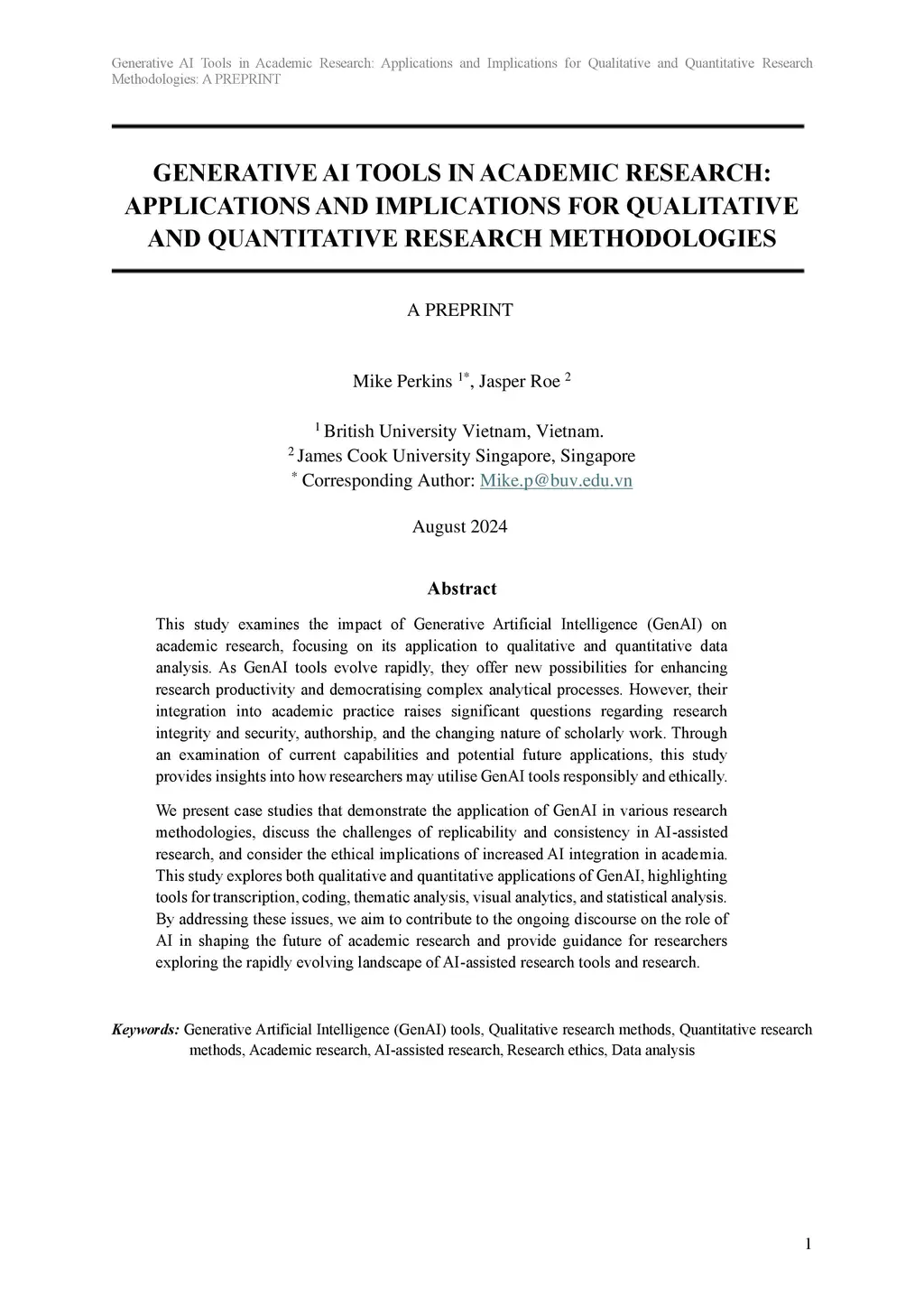This study examines the impact of Generative Artificial Intelligence (GenAI) on academic research, focusing on its application to qualitative and quantitative data analysis. As GenAI tools evolve rapidly, they offer new possibilities for enhancing research productivity and democratising complex analytical processes. However, their integration into academic practice raises significant questions regarding research integrity and security, authorship, and the changing nature of scholarly work. Through an examination of current capabilities and potential future applications, this study provides insights into how researchers may utilise GenAI tools responsibly and ethically. We present case studies that demonstrate the application of GenAI in various research methodologies, discuss the challenges of replicability and consistency in AI-assisted research, and consider the ethical implications of increased AI integration in academia. This study explores both qualitative and quantitative applications of GenAI, highlighting tools for transcription, coding, thematic analysis, visual analytics, and statistical analysis. By addressing these issues, we aim to contribute to the ongoing discourse on the role of AI in shaping the future of academic research and provide guidance for researchers exploring the rapidly evolving landscape of AI-assisted research tools and research.