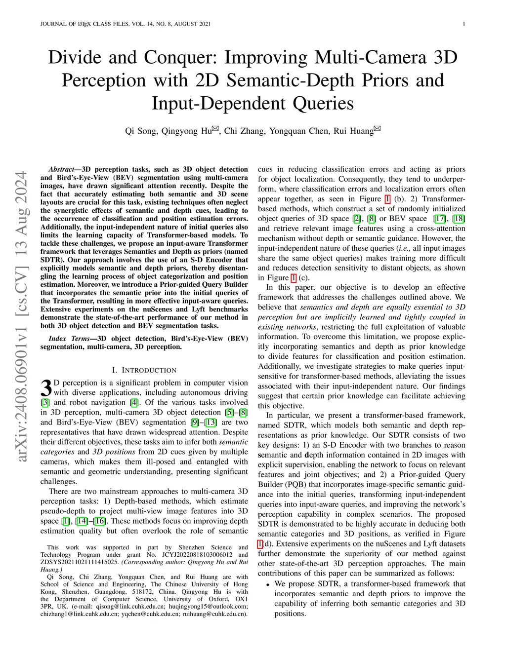 3D perception tasks, such as 3D object detection and Bird's-Eye-View (BEV) segmentation using multi-camera images, have drawn significant attention recently. Despite the fact that accurately estimating both semantic and 3D scene layouts are crucial for this task, existing techniques often neglect the synergistic effects of semantic and depth cues, leading to the occurrence of classification and position estimation errors. Additionally, the input-independent nature of initial queries also limits the learning capacity of Transformer-based models. To tackle these challenges, we propose an input-aware Transformer framework that leverages Semantics and Depth as priors (named SDTR). Our approach involves the use of an S-D Encoder that explicitly models semantic and depth priors, thereby disentangling the learning process of object categorization and position estimation. Moreover, we introduce a Prior-guided Query Builder that incorporates the semantic prior into the initial queries of the Transformer, resulting in more effective input-aware queries. Extensive experiments on the nuScenes and Lyft benchmarks demonstrate the state-of-the-art performance of our method in both 3D object detection and BEV segmentation tasks.