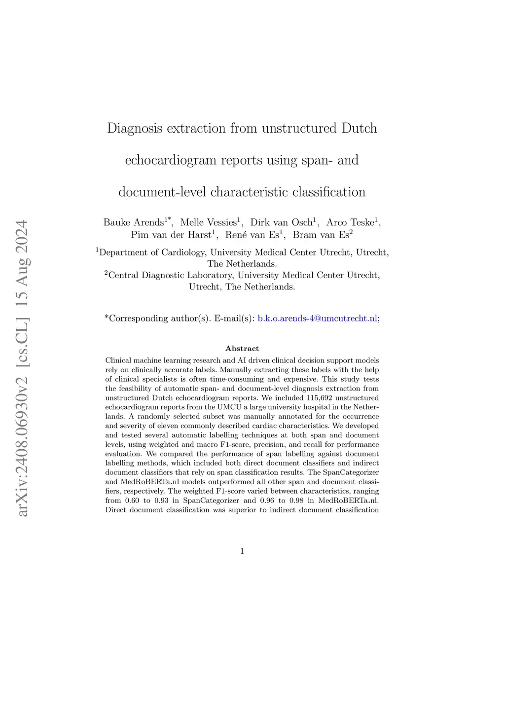 Clinical machine learning research and AI driven clinical decision support models rely on clinically accurate labels. Manually extracting these labels with the help of clinical specialists is often time-consuming and expensive. This study tests the feasibility of automatic span- and document-level diagnosis extraction from unstructured Dutch echocardiogram reports. We included 115,692 unstructured echocardiogram reports from the UMCU a large university hospital in the Netherlands. A randomly selected subset was manually annotated for the occurrence and severity of eleven commonly described cardiac characteristics. We developed and tested several automatic labelling techniques at both span and document levels, using weighted and macro F1-score, precision, and recall for performance evaluation. We compared the performance of span labelling against document labelling methods, which included both direct document classifiers and indirect document classifiers that rely on span classification results. The SpanCategorizer and MedRoBERTanl models outperformed all other span and document classifiers, respectively. The weighted F1-score varied between characteristics, ranging from 0.60 to 0.93 in SpanCategorizer and 0.96 to 0.98 in MedRoBERTanl. Direct document classification was superior to indirect document classification using span classifiers. SetFit achieved competitive document classification performance using only 10% of the training data. Utilizing a reduced label set yielded near-perfect document classification results. We recommend using our published SpanCategorizer and MedRoBERTanl models for span- and document-level diagnosis extraction from Dutch echocardiography reports. For settings with limited training data, SetFit may be a promising alternative for document classification.