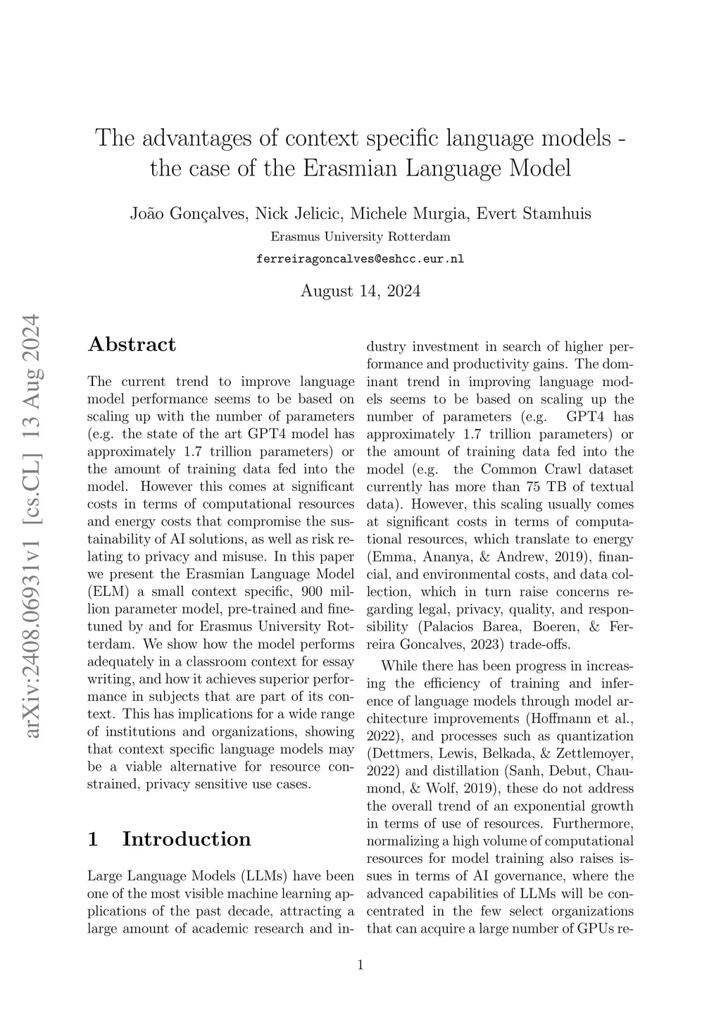 The current trend to improve language model performance seems to be based on scaling up with the number of parameters (e.g. the state of the art GPT4 model has approximately 1.7 trillion parameters) or the amount of training data fed into the model. However this comes at significant costs in terms of computational resources and energy costs that compromise the sustainability of AI solutions, as well as risk relating to privacy and misuse. In this paper we present the Erasmian Language Model (ELM) a small context specific, 900 million parameter model, pre-trained and fine-tuned by and for Erasmus University Rotterdam. We show how the model performs adequately in a classroom context for essay writing, and how it achieves superior performance in subjects that are part of its context. This has implications for a wide range of institutions and organizations, showing that context specific language models may be a viable alternative for resource constrained, privacy sensitive use cases.