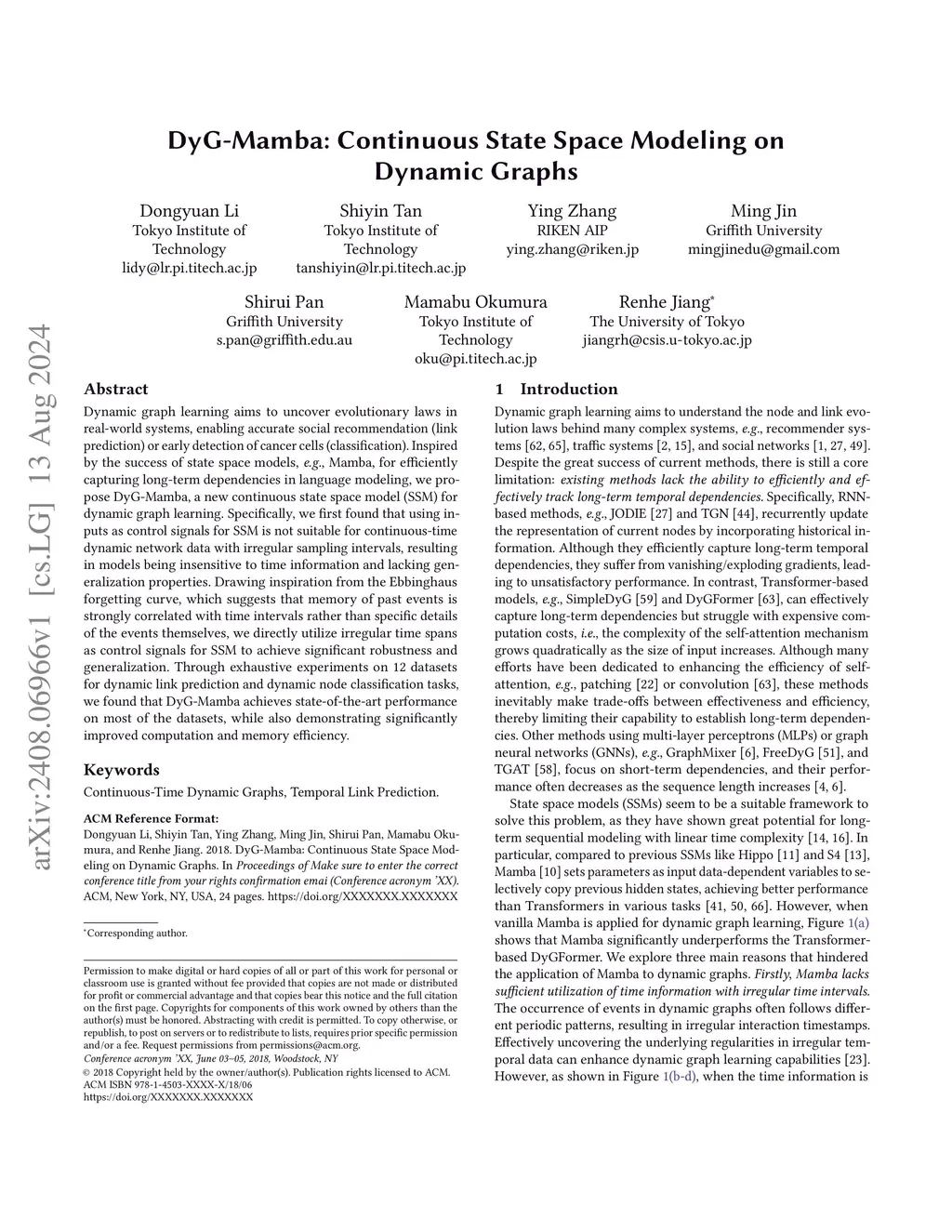 Dynamic graph modeling aims to uncover evolutionary patterns in real-world systems, enabling accurate social recommendation and early detection of cancer cells. Inspired by the success of recent state space models in efficiently capturing long-term dependencies, we propose DyG-Mamba by translating dynamic graph modeling into a long-term sequence modeling problem. Specifically, inspired by Ebbinghaus' forgetting curve, we treat the irregular timespans between events as control signals, allowing DyG-Mamba to dynamically adjust the forgetting of historical information. This mechanism ensures effective usage of irregular timespans, thereby improving both model effectiveness and inductive capability. In addition, inspired by Ebbinghaus' review cycle, we redefine core parameters to ensure that DyG-Mamba selectively reviews historical information and filters out noisy inputs, further enhancing the model's robustness. Through exhaustive experiments on 12 datasets covering dynamic link prediction and node classification tasks, we show that DyG-Mamba achieves state-of-the-art performance on most datasets, while demonstrating significantly improved computational and memory efficiency. Code is available atthis https URL.