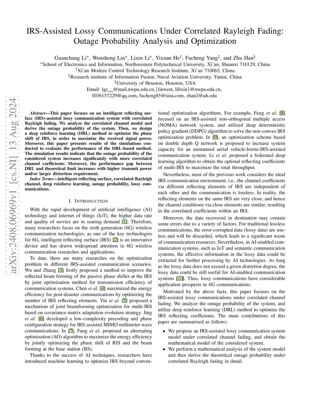 This paper focuses on an intelligent reflecting surface (IRS)-assisted lossy communication system with correlated Rayleigh fading. We analyze the correlated channel model and derive the outage probability of the system. Then, we design a deep reinforce learning (DRL) method to optimize the phase shift of IRS, in order to maximize the received signal power. Moreover, this paper presents results of the simulations conducted to evaluate the performance of the DRL-based method. The simulation results indicate that the outage probability of the considered system increases significantly with more correlated channel coefficients. Moreover, the performance gap between DRL and theoretical limit increases with higher transmit power and/or larger distortion requirement.