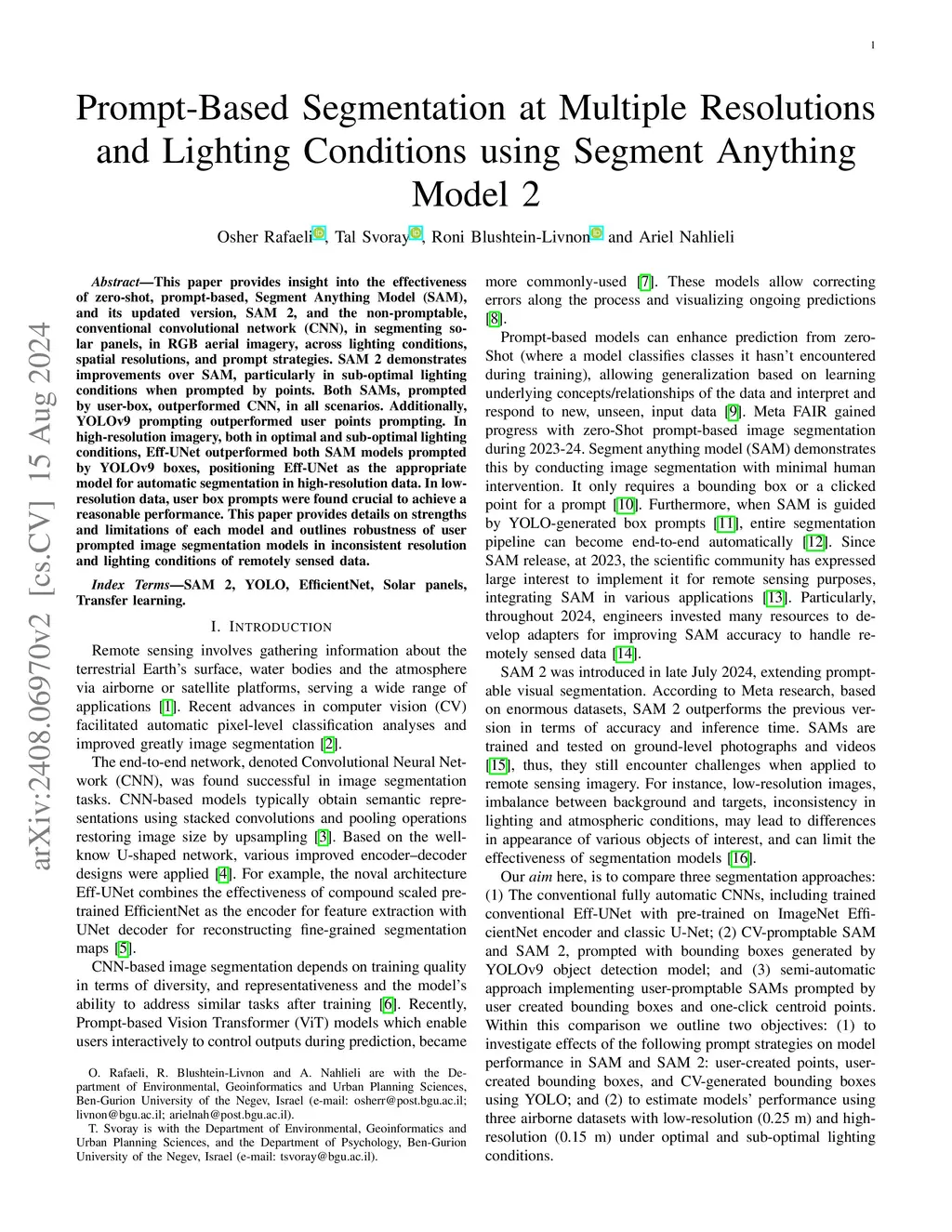 This paper provides insights on the effectiveness of the zero shot, prompt-based Segment Anything Model (SAM) and its updated versions, SAM 2 and SAM 2.1, along with the non-promptable conventional neural network (CNN), for segmenting solar panels in RGB aerial remote sensing imagery. The study evaluates these models across diverse lighting conditions, spatial resolutions, and prompt strategies. SAM 2 showed slight improvements over SAM, while SAM 2.1 demonstrated notable improvements, particularly in sub-optimal lighting and low resolution conditions. SAM models, when prompted by user-defined boxes, outperformed CNN in all scenarios; in particular, user-box prompts were found crucial for achieving reasonable performance in low resolution data. Additionally, under high resolution, YOLOv9 automatic prompting outperformed user-points prompting by providing reliable prompts to SAM. Under low resolution, SAM 2.1 prompted by user points showed similar performance to SAM 2.1 prompted by YOLOv9, highlighting its zero shot improvements with a single click. In high resolution with optimal lighting imagery, Eff-UNet outperformed SAMs prompted by YOLOv9, while under sub-optimal lighting conditions, Eff-UNet, and SAM 2.1 prompted by YOLOv9, had similar performance. However, SAM is more resource-intensive, and despite improved inference time of SAM 2.1, Eff-UNet is more suitable for automatic segmentation in high resolution data. This research details strengths and limitations of each model and outlines the robustness of user-prompted image segmentation models.